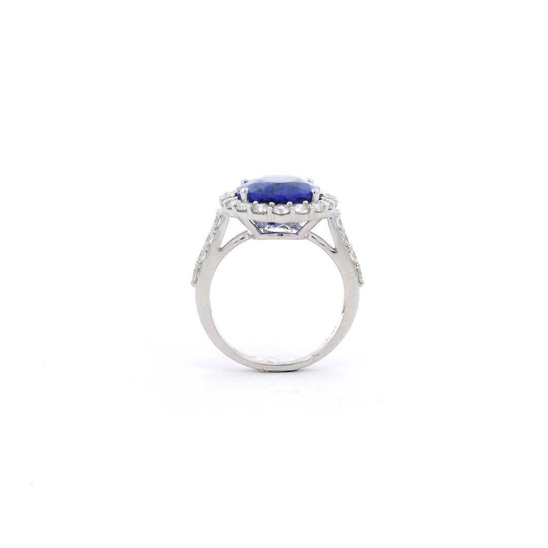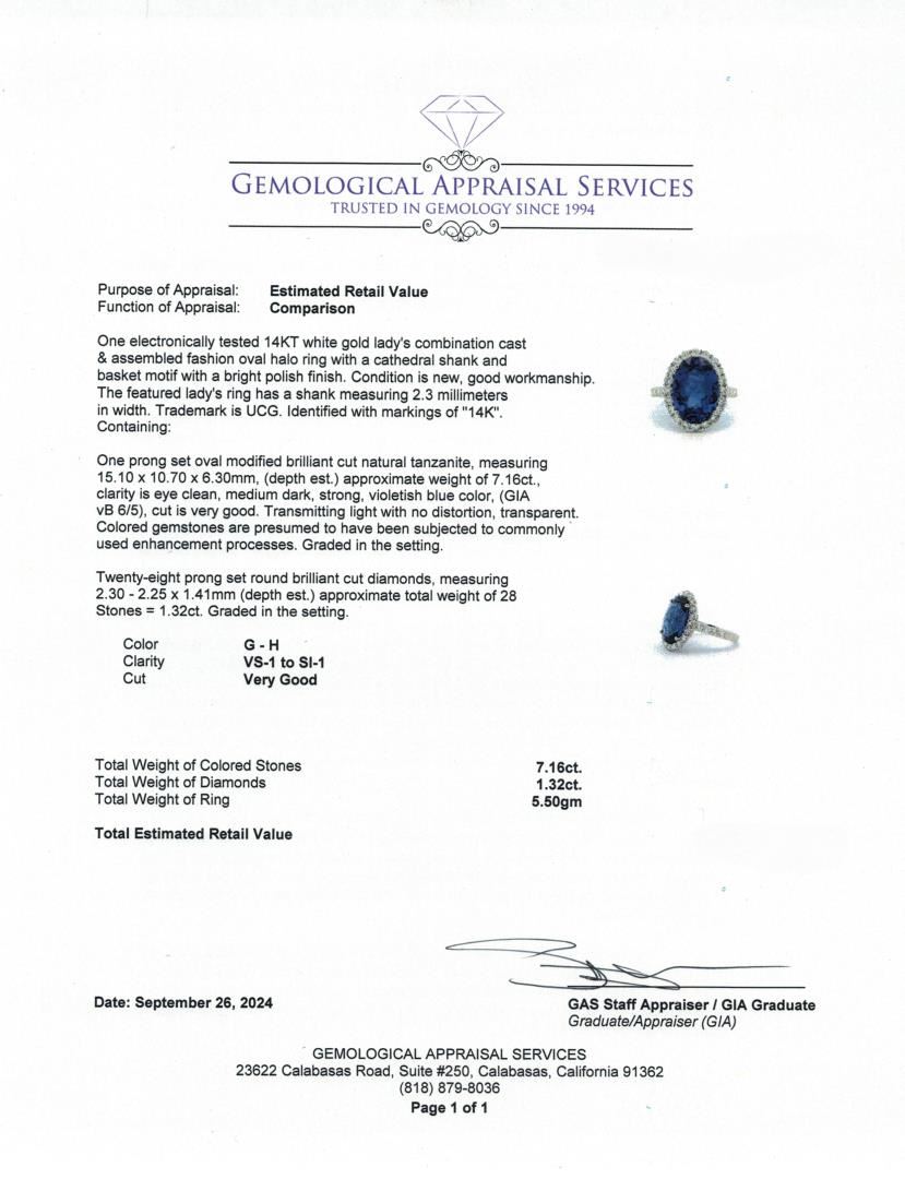 One electronically tested 14KT white gold lady's combination cast & assembled fashion oval halo ring with a cathedral shank and basket motif with a bright polish finish. The featured lady's ring has a shank measuring 2.3 millimeters in width. Trademark is UCG. Identified with markings of "14K". Condition is new, good workmanship. Containing: One prong set oval modified brilliant cut natural tanzanite, measuring 15.10 x 10.70 x 6.30mm, (depth est.) approximate weight of 7.16ct., clarity is eye clean, medium dark, strong, violetish blue color, (GIA vB 6/5), cut is very good. Transmitting light with no distortion, transparent. Colored gemstones are presumed to have been subjected to commonly used enhancement processes. Graded in the setting. Twenty-Eight prong set round brilliant cut diamonds, measuring 2.30 - 2.25 x 1.41mm (depth est.) approximate total weight of 28 Stones = 1.32ct. Graded in the setting. Color: G - H. Clarity: VS-1 to SI-1. Cut: Very Good. Total Weight of Colored Stones: 7.16ct. Total Weight of Diamonds: 1.32ct. Total Weight of Ring: 5.50gm. Appraised by Gemological Appraisal Services. GAS Appraised.