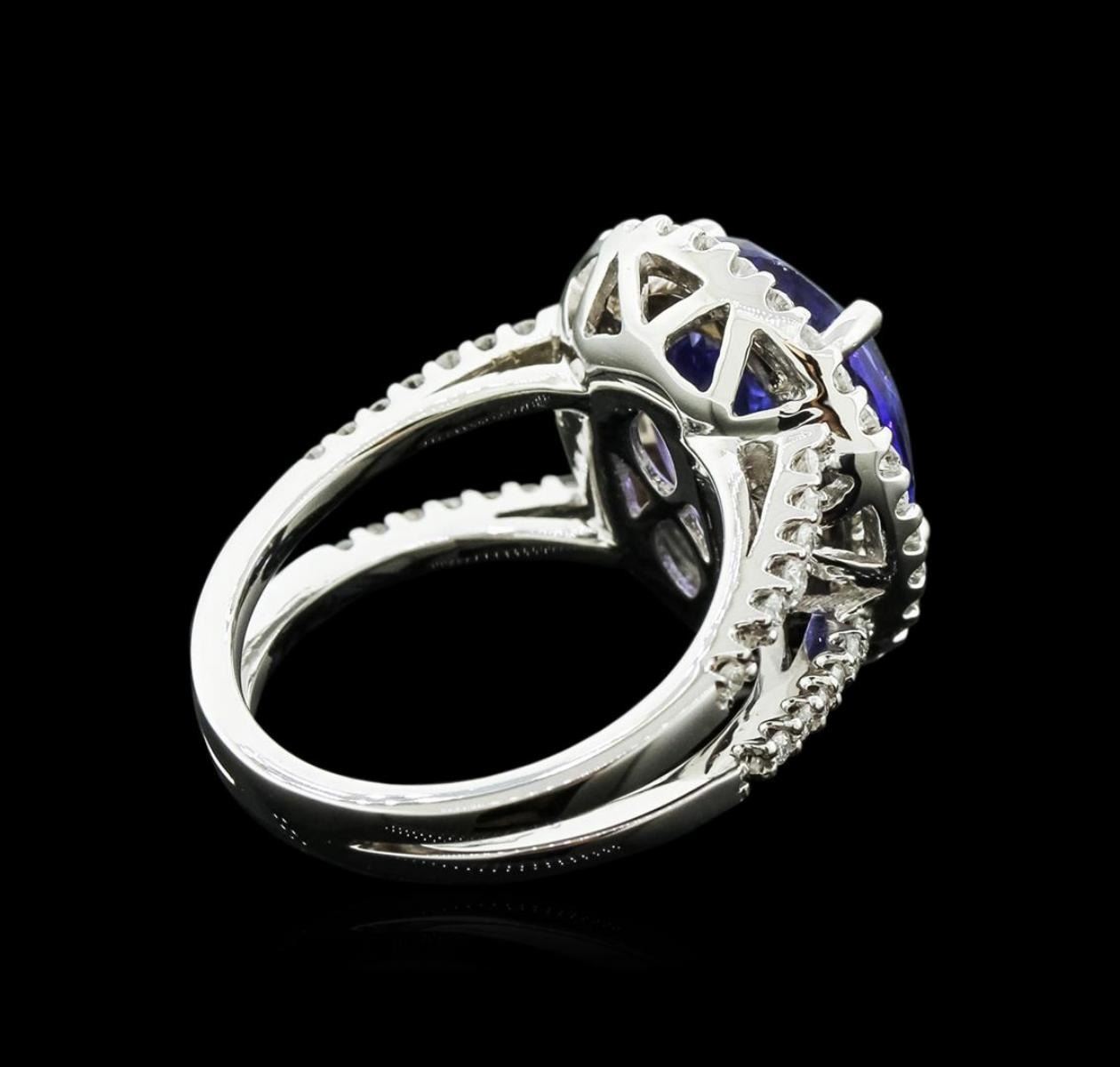 One electronically tested 14KT white gold ladies cast tanzanite and diamond ring with a bright and brushed finish. Identified with markings of "14K". Condition is new. Containing: One prong set oval modified brilliant cut natural tanzanite, measuring 13.00. x 11.00. x 7.16mm, approximate weight of 7.20 ct., clarity is eye clean, type I, medium, moderately strong, violetish blue color, (GIA vB 5/4), cut is good. Fifty-Nine prong set round brilliant cut diamonds, measuring 1.30 - 1.30 x 0.78mm (depth est.) approximate total weight of 59 Stones = 0.47ct. Clarity: SI-2 to I-1. Color: I - J. Colored gemstones are presumed to have been subjected to commonly used enhancement processes. All diamonds and colored gemstones are graded in the mounting, unless otherwise stated. Total Weight of Colored Stones 7.20 ct. Total Weight of Diamonds 0.47ct. Total Weight of Ring 8.00. grams. GGL Appraised.