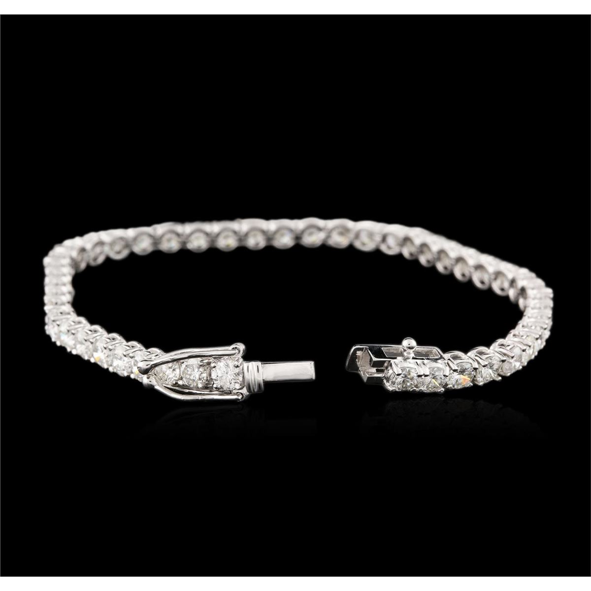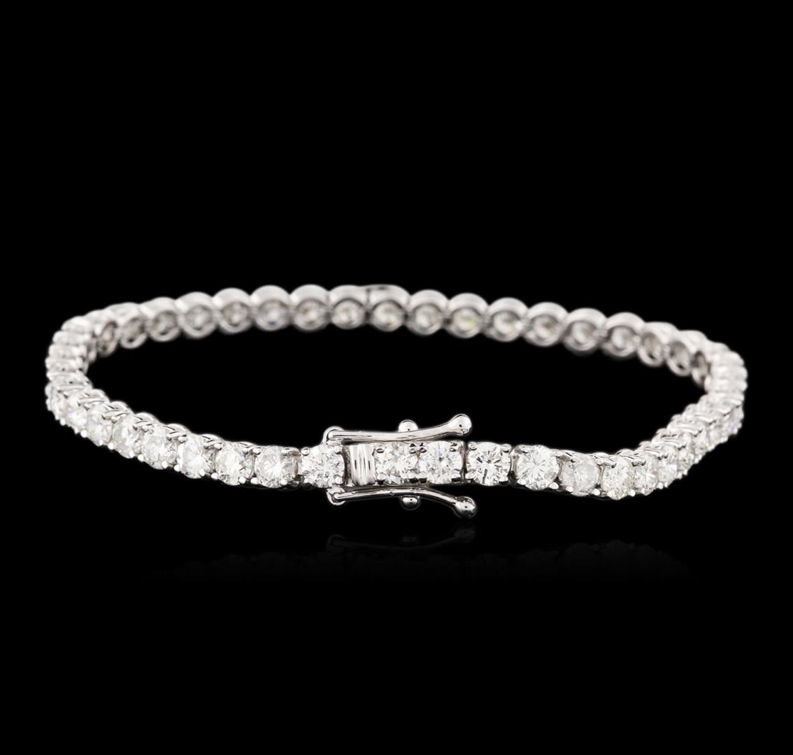 One electronically tested 14KT white gold ladies cast diamond tennis bracelet with a hidden box clasp with a bright and brushed finish. Measurements: 6.75." in length. Identified with markings of "14K". Condition is new. Containing: Forty-Six prong set round brilliant cut diamonds, measuring 3.50 - 3.50 x 2.10mm (depth est.) approximate total weight of 46 Stones = 7.22ct. Clarity: SI-1 to I-1. Color: I - K. All diamonds are graded in the mounting, unless otherwise stated. Total Weight of Diamonds 7.22ct. Total Weight of Tennis Bracelet 12.80 grams. GGL Appraised at $17,785.00.