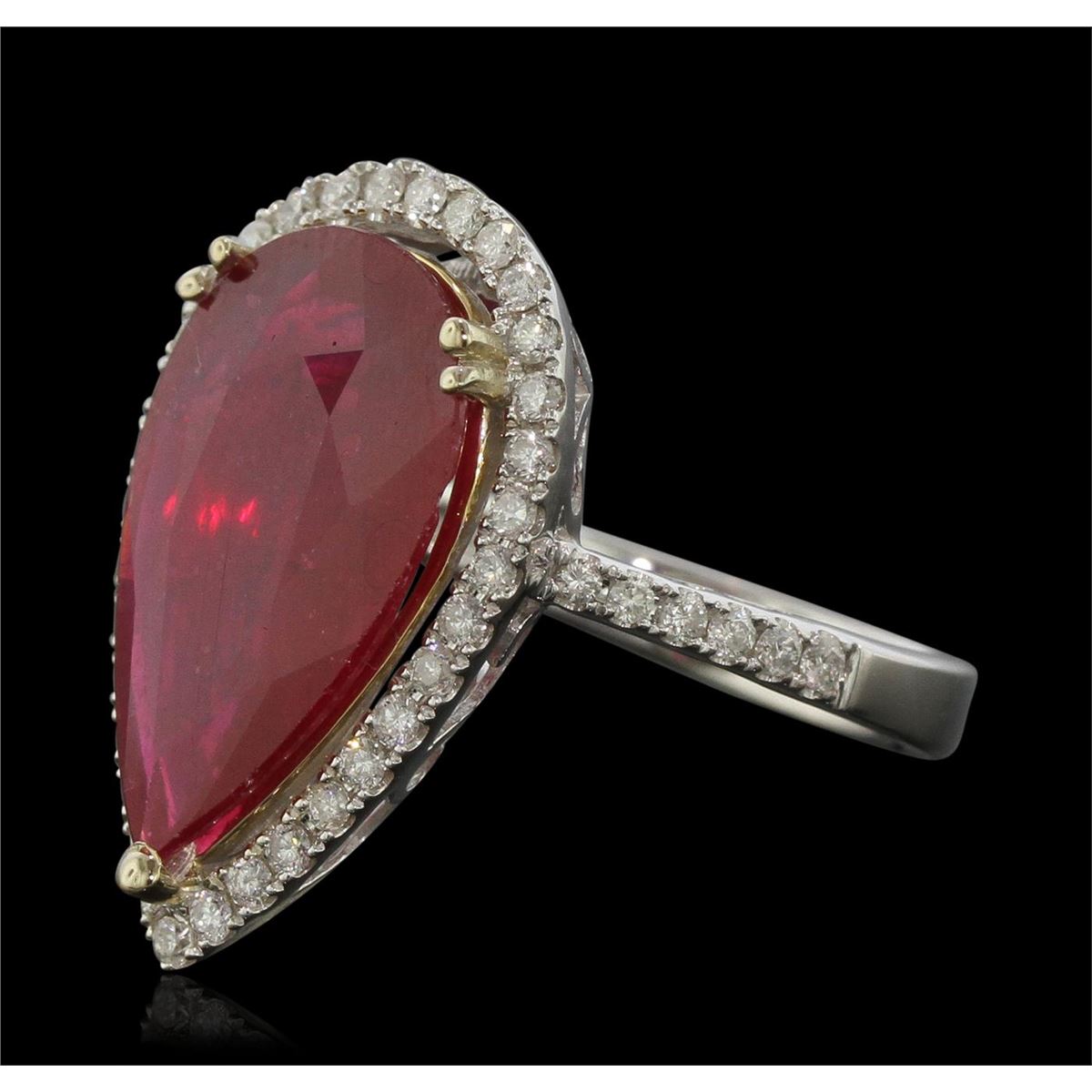 One electronically tested 14KT white gold ladies cast ruby and diamond ring with a bright polish finish. Condition is new, good workmanship. The featured ruby is set within a diamond bezel supported by diamond set shoulders, completed by a three millimeter wide band. Identified with markings of "14K". Containing: One prong set pear mixed cut natural ruby, measuring 19.00 x 11.50 x 3.60mm, 15%. bulge factor, approximate weight of 7.24ct., clarity is heavily included, type II, medium dark, very slightly brownish, red color, (GIA R 6/3), cut is good. Transmitting light somewhat diffusely, transparent to translucent. Naturally occurring internal & external characteristics are present. Indications of laboratory high temperature heat treatment, with glass & flux additives. Colored Stone Grading Report attached. Graded in the setting. Ruby has a low tolerance to rhodium plating, repolishing the surface, & ultrasonic cleaning. Forty-Six prong set round brilliant cut diamonds, measuring 1.60 - 1.20 x 0.84mm (depth est.) approximate. Total Weight of 46 Stones = 0.56ct. Graded in the setting. Clarity: SI-1 to I-1. Color: G - I. Total Weight of Colored Stones 7.24ct. Total Weight of Diamonds 0.56ct. Total Weight of Ring 6.92grams. AIG Appraised at $4,795.00.