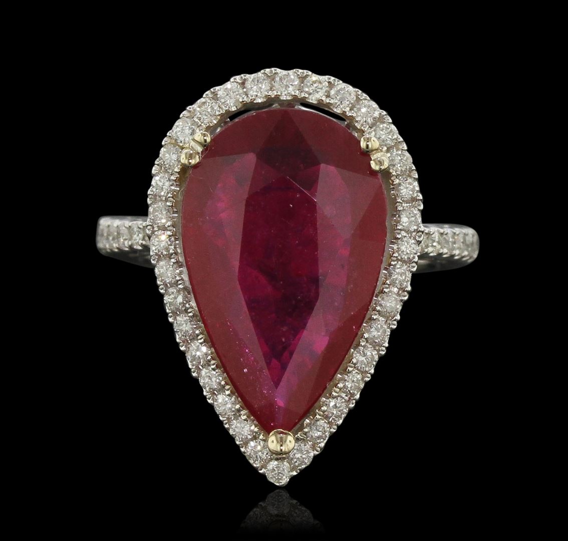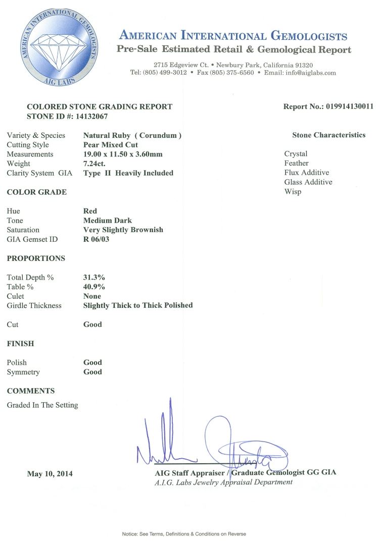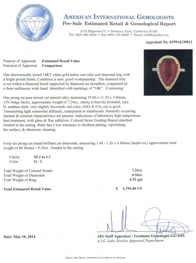 One electronically tested 14KT white gold ladies cast ruby and diamond ring with a bright polish finish. Condition is new, good workmanship. The featured ruby is set within a diamond bezel supported by diamond set shoulders, completed by a three millimeter wide band. Identified with markings of "14K". Containing: One prong set pear mixed cut natural ruby, measuring 19.00 x 11.50 x 3.60mm, 15%. bulge factor, approximate weight of 7.24ct., clarity is heavily included, type II, medium dark, very slightly brownish, red color, (GIA R 6/3), cut is good. Transmitting light somewhat diffusely, transparent to translucent. Naturally occurring internal & external characteristics are present. Indications of laboratory high temperature heat treatment, with glass & flux additives. Colored Stone Grading Report attached. Graded in the setting. Ruby has a low tolerance to rhodium plating, repolishing the surface, & ultrasonic cleaning. Forty-Six prong set round brilliant cut diamonds, measuring 1.60 - 1.20 x 0.84mm (depth est.) approximate. Total Weight of 46 Stones = 0.56ct. Graded in the setting. Clarity: SI-1 to I-1. Color: G - I. Total Weight of Colored Stones 7.24ct. Total Weight of Diamonds 0.56ct. Total Weight of Ring 6.92grams. AIG Appraised at $4,795.00.