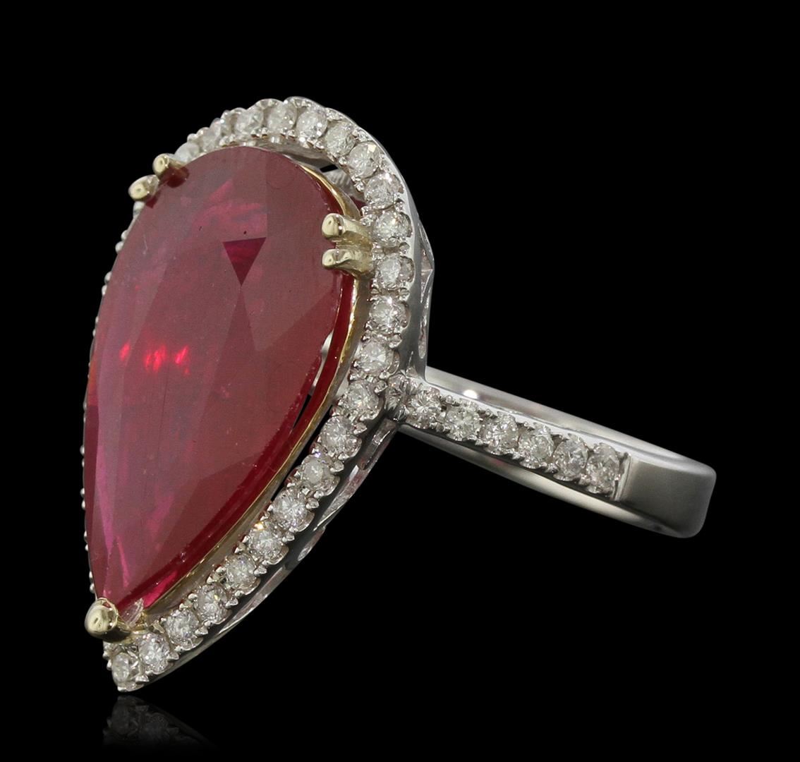 One electronically tested 14KT white gold ladies cast ruby and diamond ring with a bright polish finish. Condition is new, good workmanship. The featured ruby is set within a diamond bezel supported by diamond set shoulders, completed by a three millimeter wide band. Identified with markings of "14K". Containing: One prong set pear mixed cut natural ruby, measuring 19.00 x 11.50 x 3.60mm, 15%. bulge factor, approximate weight of 7.24ct., clarity is heavily included, type II, medium dark, very slightly brownish, red color, (GIA R 6/3), cut is good. Transmitting light somewhat diffusely, transparent to translucent. Naturally occurring internal & external characteristics are present. Indications of laboratory high temperature heat treatment, with glass & flux additives. Colored Stone Grading Report attached. Graded in the setting. Ruby has a low tolerance to rhodium plating, repolishing the surface, & ultrasonic cleaning. Forty-Six prong set round brilliant cut diamonds, measuring 1.60 - 1.20 x 0.84mm (depth est.) approximate. Total Weight of 46 Stones = 0.56ct. Graded in the setting. Clarity: SI-1 to I-1. Color: G - I. Total Weight of Colored Stones 7.24ct. Total Weight of Diamonds 0.56ct. Total Weight of Ring 6.92grams. AIG Appraised at $4,795.00.
