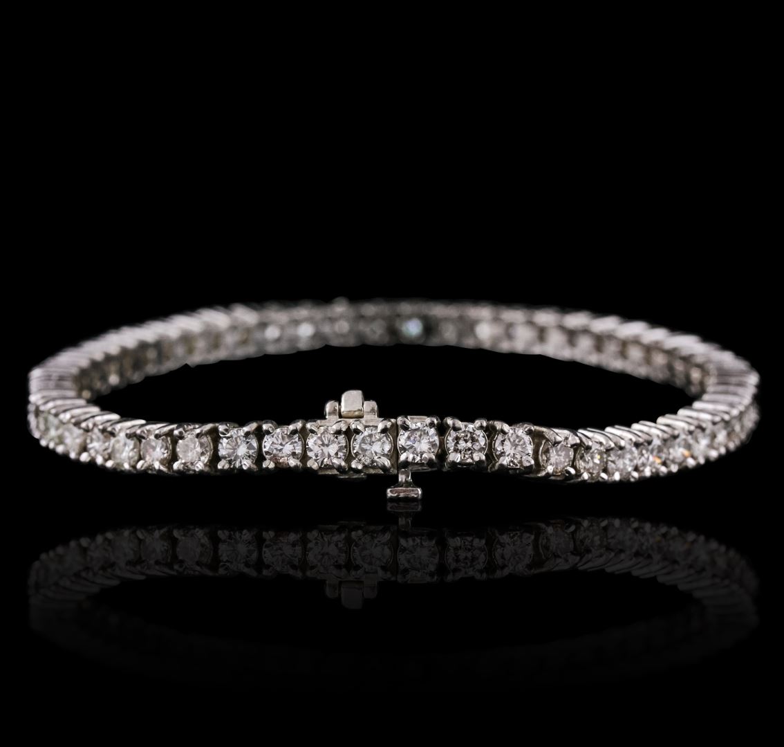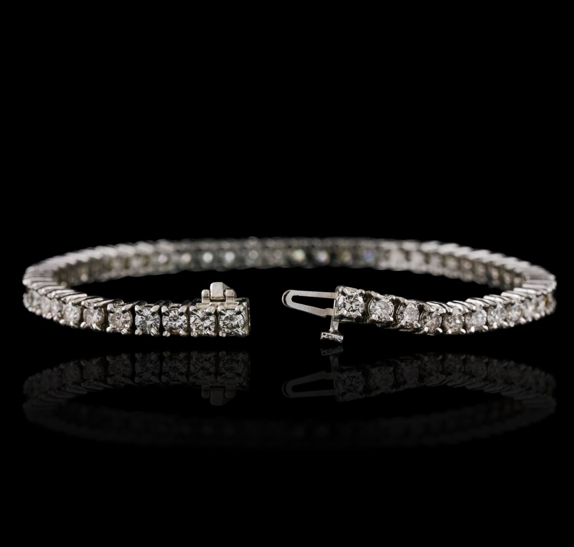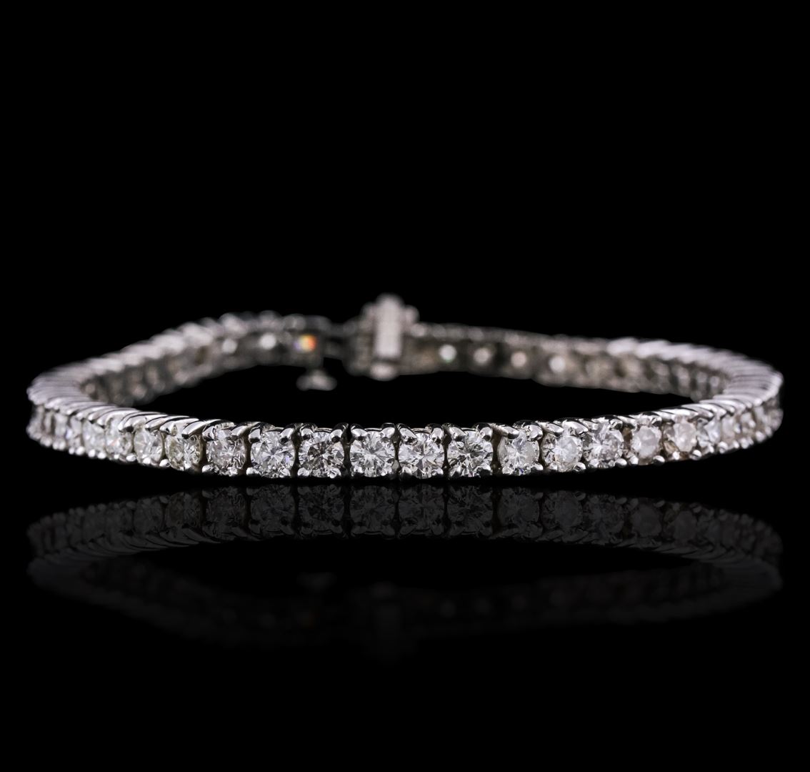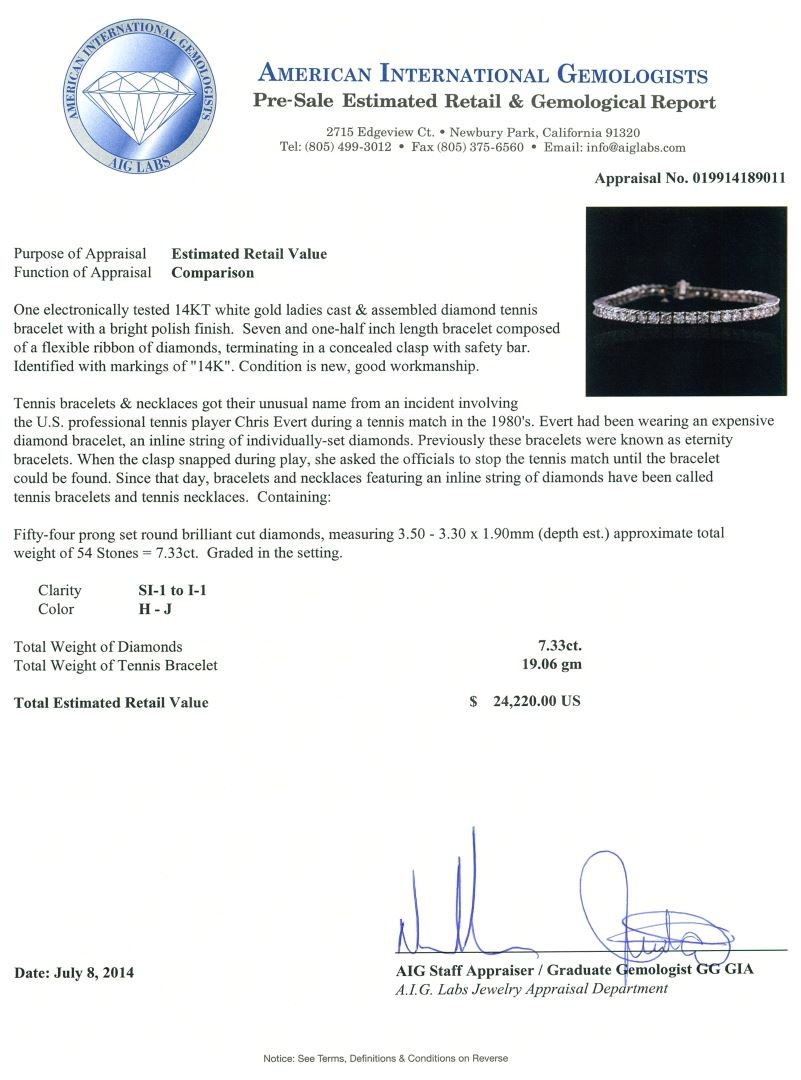 One electronically tested 14KT white gold ladies cast & assembled diamond tennis bracelet with a bright polish finish. Seven and one-half inch length bracelet composed of a flexible ribbon of diamonds, terminating in a concealed clasp with safety bar. Identified with markings of "14K". Condition is new, good workmanship. Tennis bracelets & necklaces got their unusual name from an incident involving the U.S. professional tennis player Chris Evert during a tennis match in the 1980's. Evert had been wearing an expensive diamond bracelet, an inline string of individually-set diamonds. Previously these bracelets were known as eternity bracelets. When the clasp snapped during play, she asked the officials to stop the tennis match until the bracelet could be found. Since that day, bracelets and necklaces featuring an inline string of diamonds have been called tennis bracelets and tennis necklaces. Containing: Fifty-Four prong set round brilliant cut diamonds, measuring 3.50 - 3.30 x 1.90mm (depth est.) approximate total weight of 54 Stones = 7.33ct. Graded in the setting. Clarity: SI-1 to I-1 . Color: H - J. Total Weight of Diamonds 7.33ct. Total Weight of Tennis Bracelet 19.06 grams. AIG Appraised at $24,220.00.