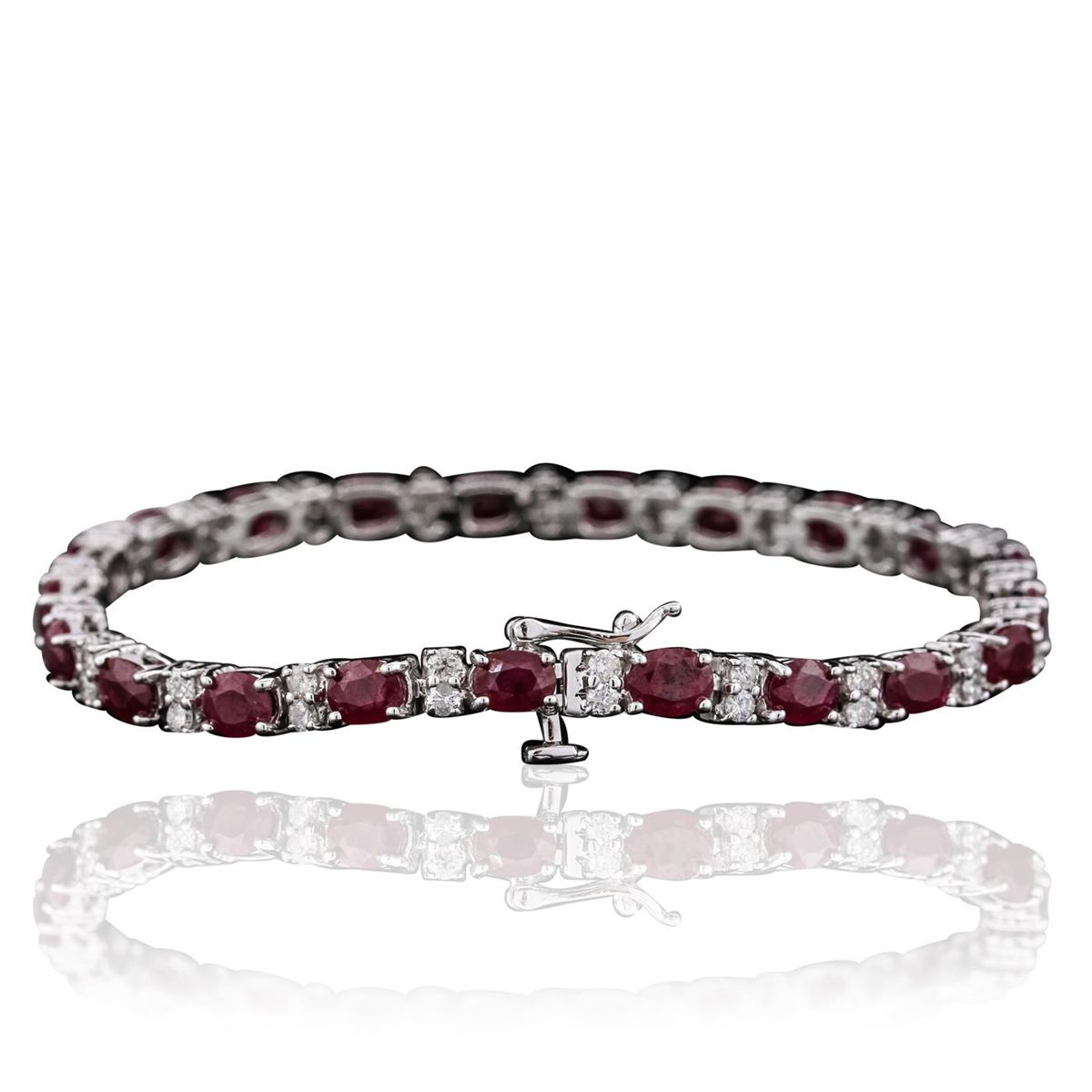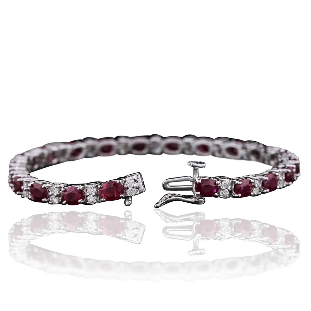14KT White Gold 7.35ctw Ruby and Diamond Bracelet. One electronically tested 14KT white gold ladies combination cast & assembled bracelet with a hidden box clasp with a bright polish finish. Measurements: 6.85" in length. Identified with markings of "14K". Condition is new. Containing: Twenty-one prong set oval modified brilliant cut natural rubies, measuring 5.20 x 4.20 x 1.99mm, approximate total weight of 7.35ct., clarity is heavily included, type II, medium dark, moderately strong, strongly purplish red color, (GIA stpR 6/4), cut is good. Forty-Two prong set round brilliant cut diamonds, measuring 2.00 - 2.00 x 1.20mm (depth est.) approximate total weight of 42 Stones = 1.23ct. Clarity: I-1 to I-2. Color: G - H, Cut is Good. Colored gemstones are presumed to have been subjected to commonly used enhancement processes. All diamonds and colored gemstones are graded in the mounting, unless otherwise stated. Total Weight of Colored Stones 7.35ct. Total Weight of Diamonds 1.23ct. Total Weight of Bracelet 12.40 grams. GGL Appraised at $8,740.00.