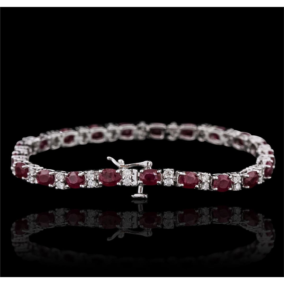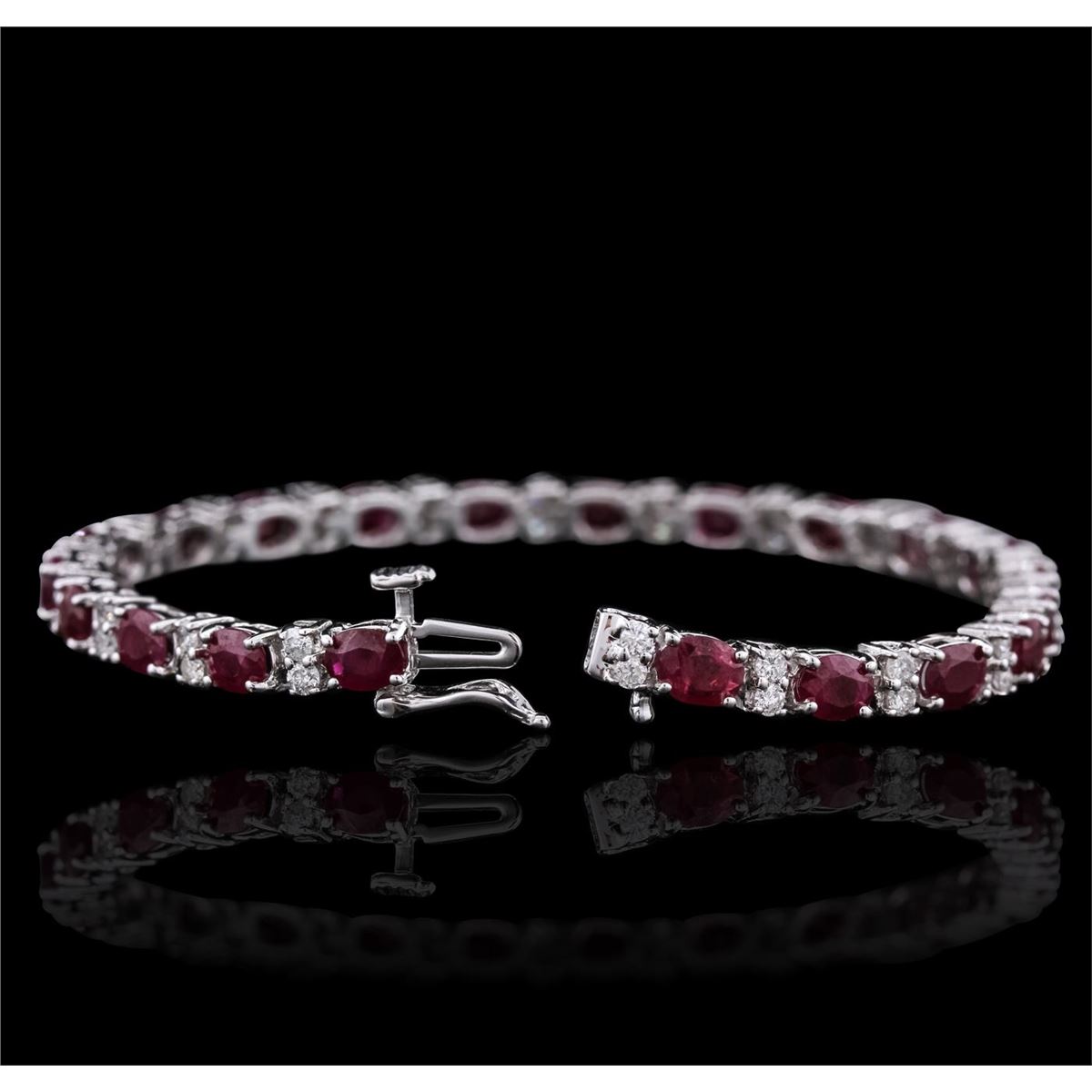 One electronically tested 14KT white gold ladies combination cast & assembled bracelet with a hidden box clasp with a bright polish finish. Measurements: 6.85" in length. Identified with markings of "14K". Condition is new. Containing: Twenty-one prong set oval modified brilliant cut natural rubies, measuring 5.20 x 4.20 x 1.99mm, approximate total weight of 7.35ct., clarity is heavily included, type II, medium dark, moderately strong, strongly purplish red color, (GIA stpR 6/4), cut is good. Forty-Two prong set round brilliant cut diamonds, measuring 2.00 - 2.00 x 1.20mm (depth est.) approximate total weight of 42 Stones = 1.23ct. Clarity: I-1 to I-2. Color: G - H, Cut is Good. Colored gemstones are presumed to have been subjected to commonly used enhancement processes. All diamonds and colored gemstones are graded in the mounting, unless otherwise stated. Total Weight of Colored Stones 7.35ct. Total Weight of Diamonds 1.23ct. Total Weight of Bracelet 12.40 grams. GGL Appraised at $8,740.00.