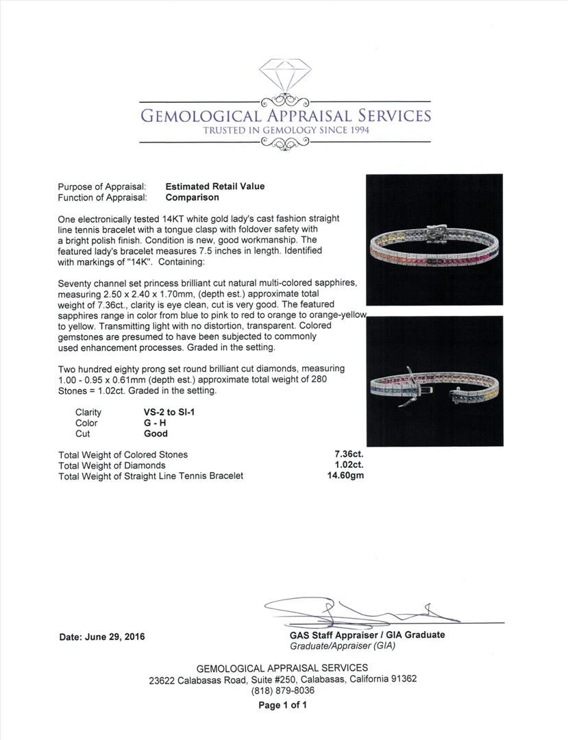One electronically tested 14KT white gold lady's cast fashion straight line tennis bracelet with a tongue clasp with foldover safety with a bright polish finish. The featured lady's bracelet measures 7.5 inches in length. Identified with markings of "14K". Condition is new, good workmanship. Containing: Seventy channel set princess brilliant cut natural multi-colored sapphires, measuring 2.50 x 2.40 x 1.70mm, (depth est.) approximate total weight of 7.36ct., clarity is eye clean, cut is very good. The featured sapphires range in color from blue to pink to red to orange to orange-yellow to yellow. Transmitting light with no distortion, transparent. Colored gemstones are presumed to have been subjected to commonly used enhancement processes. Graded in the setting.Two Hundred Eighty prong set round brilliant cut diamonds, measuring 1.00 - 0.95 x 0.61mm (depth est.) approximate total weight of 280 Stones = 1.02ct. Graded in the setting. Clarity: VS-2 to SI-1. Color: G - HCut Good. Total Weight of Colored Stones 7.36ct. Total Weight of Diamonds 1.02ct. Total Weight of Straight Line Tennis Bracelet 14.60gm. GAS Appraised.