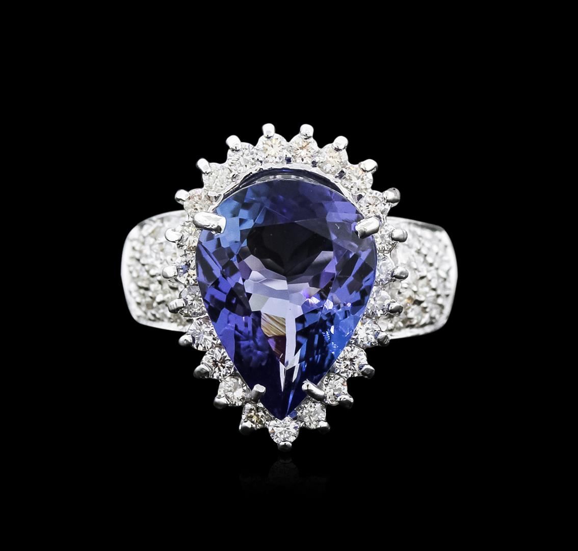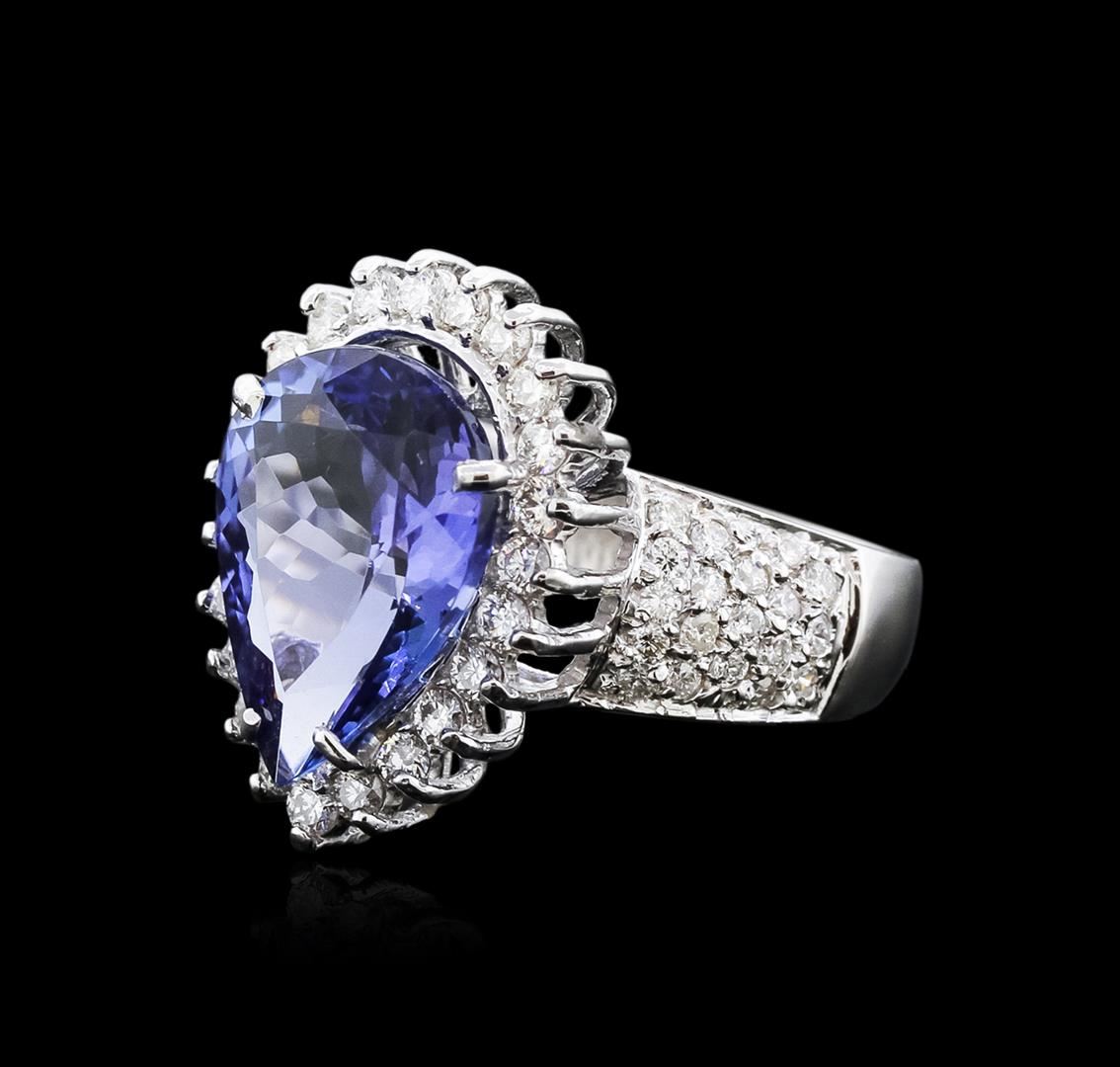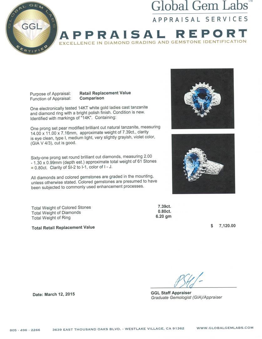 One electronically tested 14KT white gold ladies cast tanzanite and diamond ring with a bright polish finish. Identified with markings of "14K". Condition is new. Containing: One prong set pear modified brilliant cut natural tanzanite, measuring 14.00. x 11.00. x 7.16mm, approximate weight of 7.39ct., clarity is eye clean, type I, medium light, very slightly grayish, violet color, (GIA V 4/3), cut is good. Sixty-One prong set round brilliant cut diamonds, measuring 2.00. - 1.30 x 0.99mm (depth est.) approximate total weight of 61 Stones = 0.80ct. Clarity: SI-2 to I-1. Color: I - J. All diamonds and colored gemstones are graded in the mounting, unless otherwise stated. Colored gemstones are presumed to have been subjected to commonly used enhancement processes. Total Weight of Colored Stones 7.39ct. Total Weight of Diamonds 0.80ct. Total Weight of Ring 6.20 grams. GGL Appraised at $7,120.00.