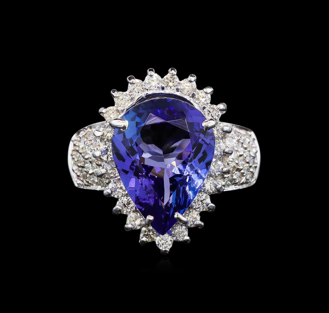 One electronically tested 14KT white gold ladies cast tanzanite and diamond ring with a bright polish finish. Identified with markings of "14K". Condition is new. Containing: One prong set pear modified brilliant cut natural tanzanite, measuring 14.00. x 11.00. x 7.16mm, approximate weight of 7.39ct., clarity is eye clean, type I, medium light, very slightly grayish, violet color, (GIA V 4/3), cut is good. Sixty-One prong set round brilliant cut diamonds, measuring 2.00. - 1.30 x 0.99mm (depth est.) approximate total weight of 61 Stones = 0.80ct. Clarity: SI-2 to I-1. Color: I - J. All diamonds and colored gemstones are graded in the mounting, unless otherwise stated. Colored gemstones are presumed to have been subjected to commonly used enhancement processes. Total Weight of Colored Stones 7.39ct. Total Weight of Diamonds 0.80ct. Total Weight of Ring 6.20 grams. GGL Appraised at $7,120.00.