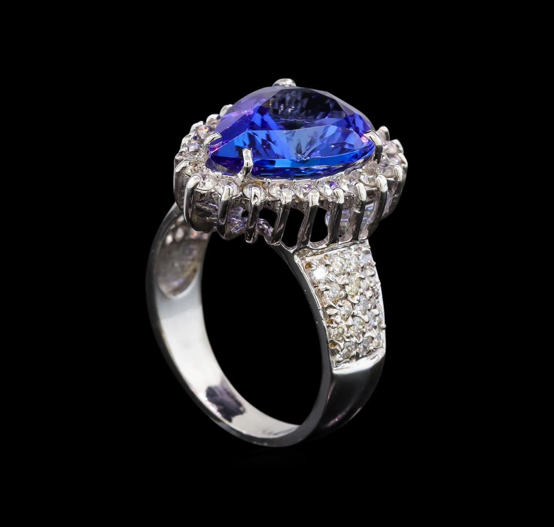 One electronically tested 14KT white gold ladies cast tanzanite and diamond ring with a bright polish finish. Identified with markings of "14K". Condition is new. Containing: One prong set pear modified brilliant cut natural tanzanite, measuring 14.00. x 11.00. x 7.16mm, approximate weight of 7.39ct., clarity is eye clean, type I, medium light, very slightly grayish, violet color, (GIA V 4/3), cut is good. Sixty-One prong set round brilliant cut diamonds, measuring 2.00. - 1.30 x 0.99mm (depth est.) approximate total weight of 61 Stones = 0.80ct. Clarity: SI-2 to I-1. Color: I - J. All diamonds and colored gemstones are graded in the mounting, unless otherwise stated. Colored gemstones are presumed to have been subjected to commonly used enhancement processes. Total Weight of Colored Stones 7.39ct. Total Weight of Diamonds 0.80ct. Total Weight of Ring 6.20 grams. GGL Appraised at $7,120.00.