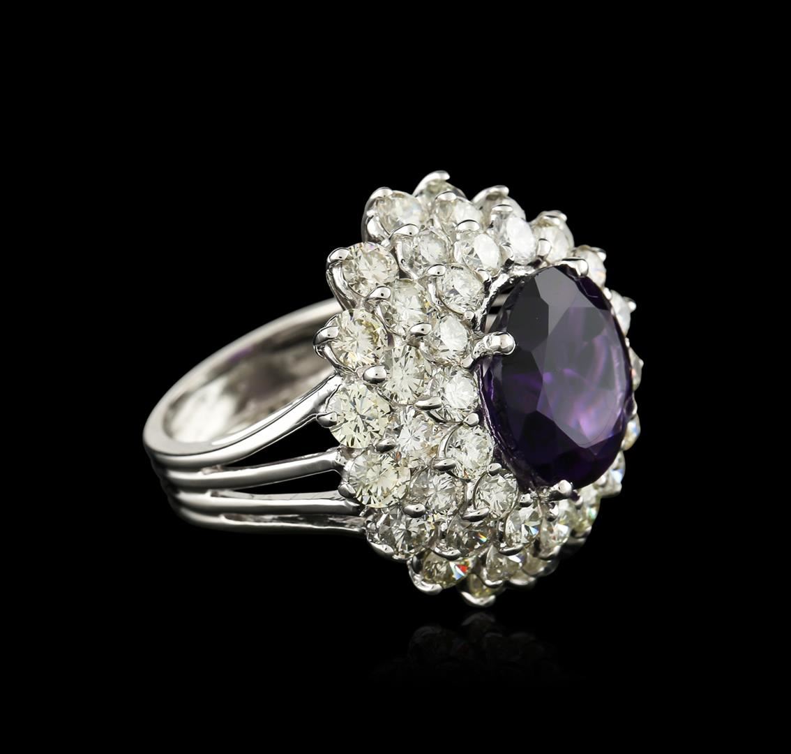 One electronically tested 14KT white gold ladies cast amethyst and diamond ring with a split shoulder shank with a bright polish finish. Identified with markings of "14K". Condition is new. Containing: One prong set round modified brilliant cut natural amethyst, measuring 12.92 - 12.92 x 8.40 mm, approximate weight of 7.46ct., clarity is eye clean, type II, medium dark, moderately strong, purple color, (GIA P 6/4), cut is good. Forty-Eight prong set round brilliant cut diamonds, measuring 3.20 - 3.20 x 1.92mm (depth est.) approximate total weight of 48 Stones = 5.76ct. Clarity: SI-2 to I-1. Color: K - L, Cut is Good. Diamonds and colored gemstones are graded in the mounting, unless otherwise stated. Colored gemstones are presumed to have been subjected to commonly used enhancement processes. Total Weight of Colored Stones 7.46ct. Total Weight of Diamonds 5.76ct. Total Weight of Ring 13.00 grams. GGL Appraised at $9,540.00.