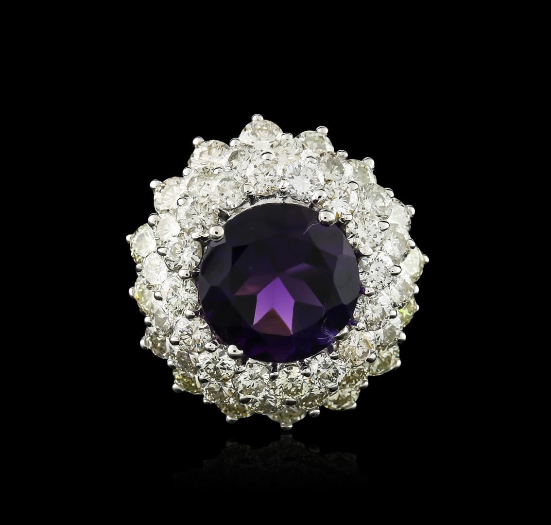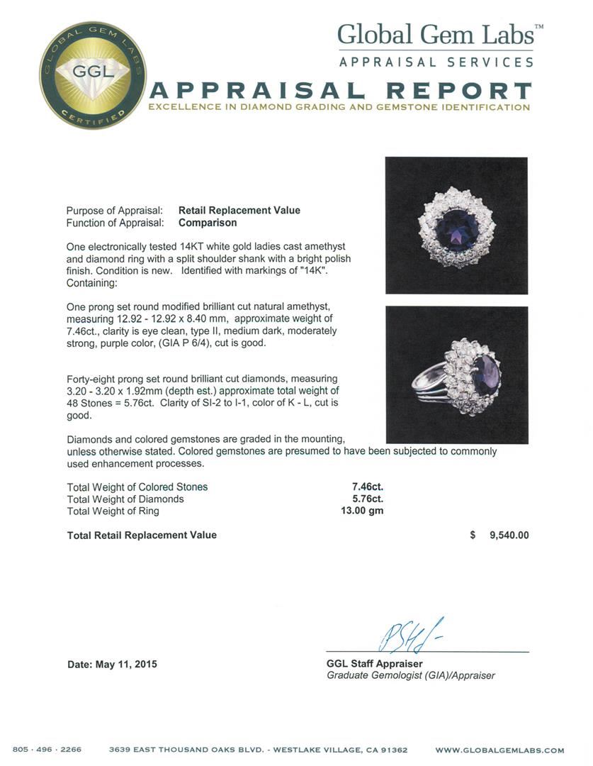 One electronically tested 14KT white gold ladies cast amethyst and diamond ring with a split shoulder shank with a bright polish finish. Identified with markings of "14K". Condition is new. Containing: One prong set round modified brilliant cut natural amethyst, measuring 12.92 - 12.92 x 8.40 mm, approximate weight of 7.46ct., clarity is eye clean, type II, medium dark, moderately strong, purple color, (GIA P 6/4), cut is good. Forty-Eight prong set round brilliant cut diamonds, measuring 3.20 - 3.20 x 1.92mm (depth est.) approximate total weight of 48 Stones = 5.76ct. Clarity: SI-2 to I-1. Color: K - L, Cut is Good. Diamonds and colored gemstones are graded in the mounting, unless otherwise stated. Colored gemstones are presumed to have been subjected to commonly used enhancement processes. Total Weight of Colored Stones 7.46ct. Total Weight of Diamonds 5.76ct. Total Weight of Ring 13.00 grams. GGL Appraised at $9,540.00.