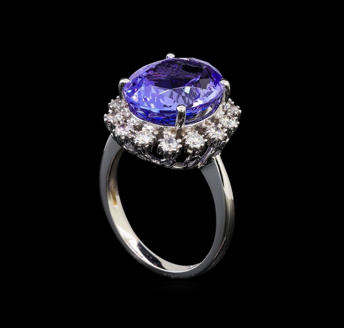 One electronically tested 14KT white gold ladies cast tanzanite and diamond ring with a bright polish finish. Identified with markings of "K14". Condition is new. Containing: One prong set oval modified brilliant cut natural tanzanite, measuring 13.50 x 11.00 x 7.16mm, approximate weight of 7.48ct., clarity is eye clean, type I, medium light, very slightly grayish, violet color, (GIA V 4/3), cut is good. Fourteen prong set round brilliant cut diamonds, measuring 2.00 - 2.00 x 1.20mm (depth est.) approximate total weight of 14 Stones = 0.41ct. Clarity: I-1. Color: I - J, Cut is Good. Colored gemstones are presumed to have been subjected to commonly used enhancement processes. All diamonds and colored gemstones are graded in the mounting, unless otherwise stated. Total Weight of Colored Stones 7.48ct. Total Weight of Diamonds 0.41ct. Total Weight of Ring 6.10 grams. GGL Appraised at $5,270.00.