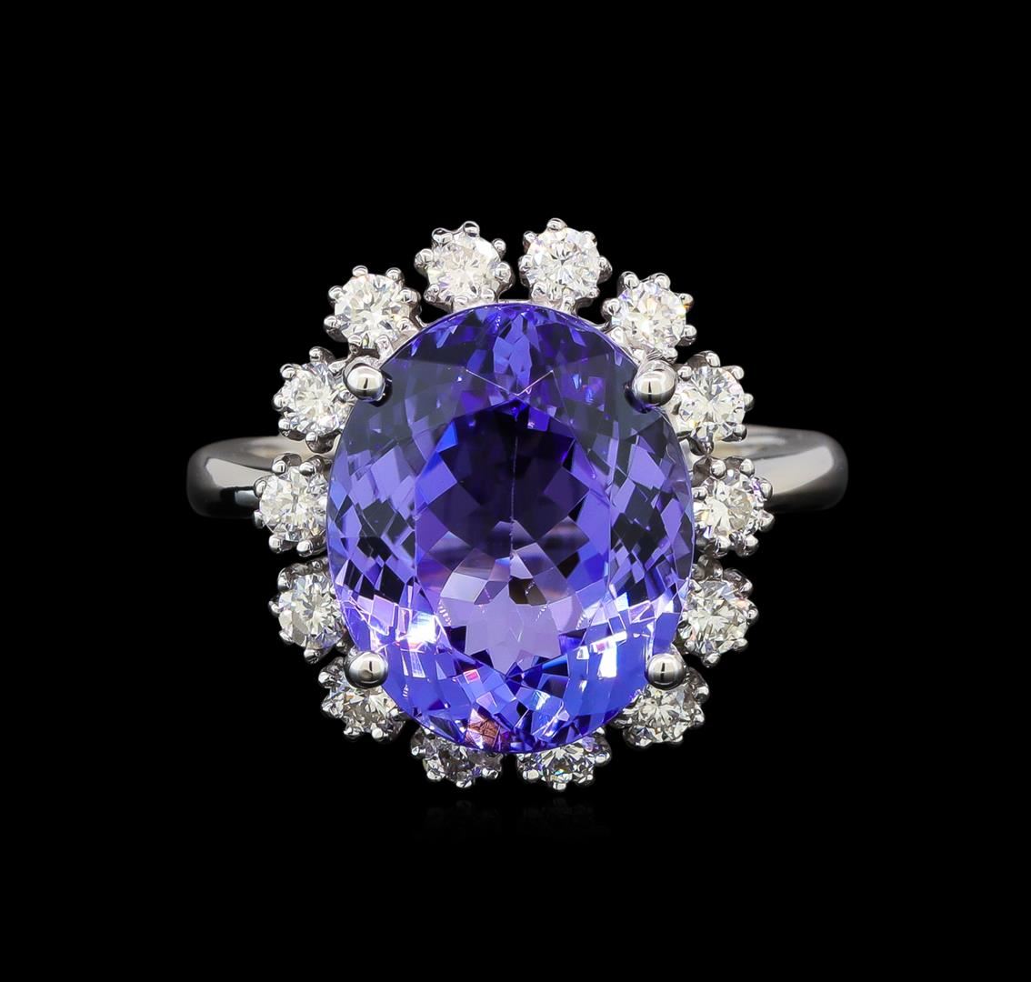 One electronically tested 14KT white gold ladies cast tanzanite and diamond ring with a bright polish finish. Identified with markings of "K14". Condition is new. Containing: One prong set oval modified brilliant cut natural tanzanite, measuring 13.50 x 11.00 x 7.16mm, approximate weight of 7.48ct., clarity is eye clean, type I, medium light, very slightly grayish, violet color, (GIA V 4/3), cut is good. Fourteen prong set round brilliant cut diamonds, measuring 2.00 - 2.00 x 1.20mm (depth est.) approximate total weight of 14 Stones = 0.41ct. Clarity: I-1. Color: I - J, Cut is Good. Colored gemstones are presumed to have been subjected to commonly used enhancement processes. All diamonds and colored gemstones are graded in the mounting, unless otherwise stated. Total Weight of Colored Stones 7.48ct. Total Weight of Diamonds 0.41ct. Total Weight of Ring 6.10 grams. GGL Appraised at $5,270.00.