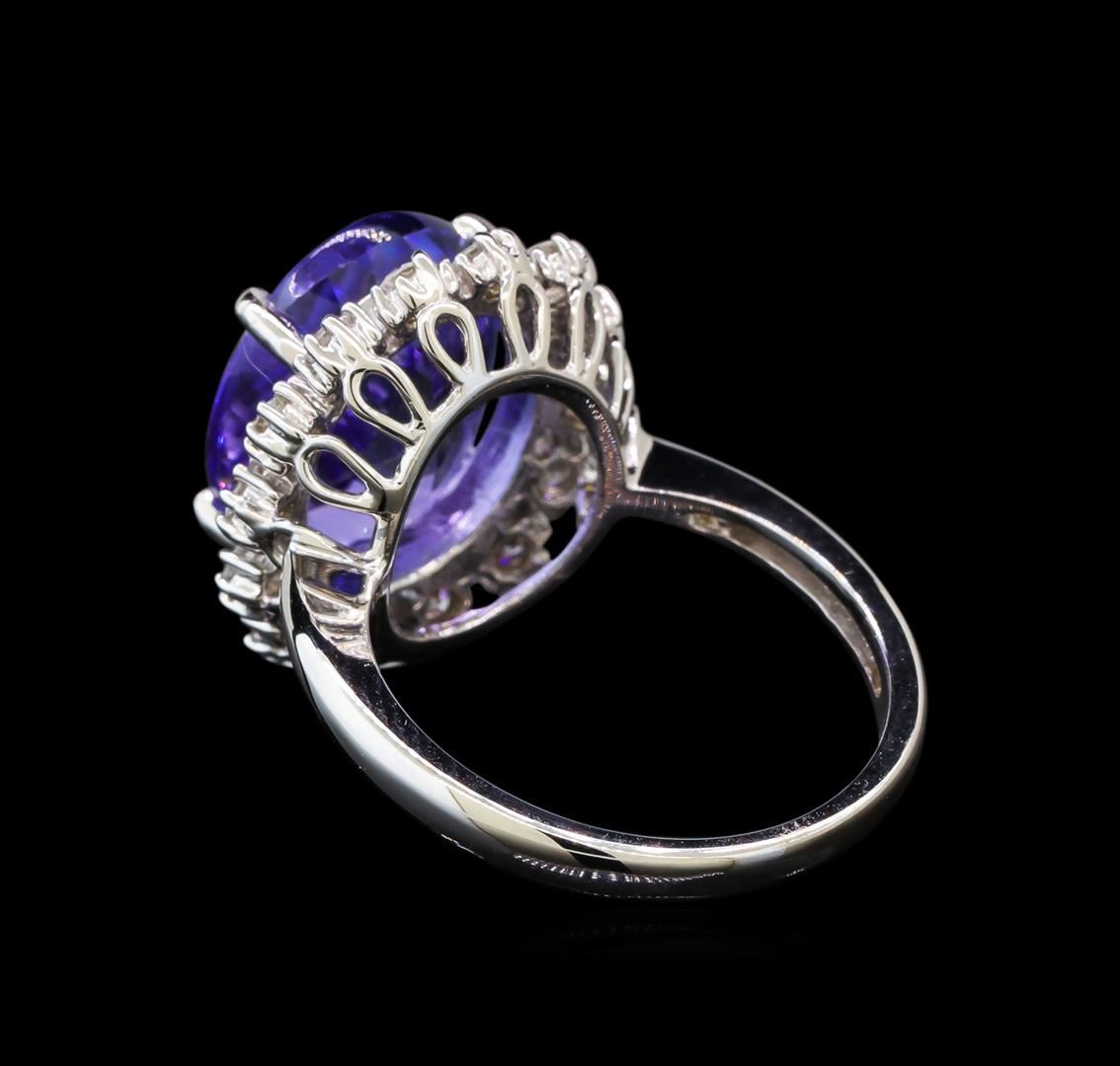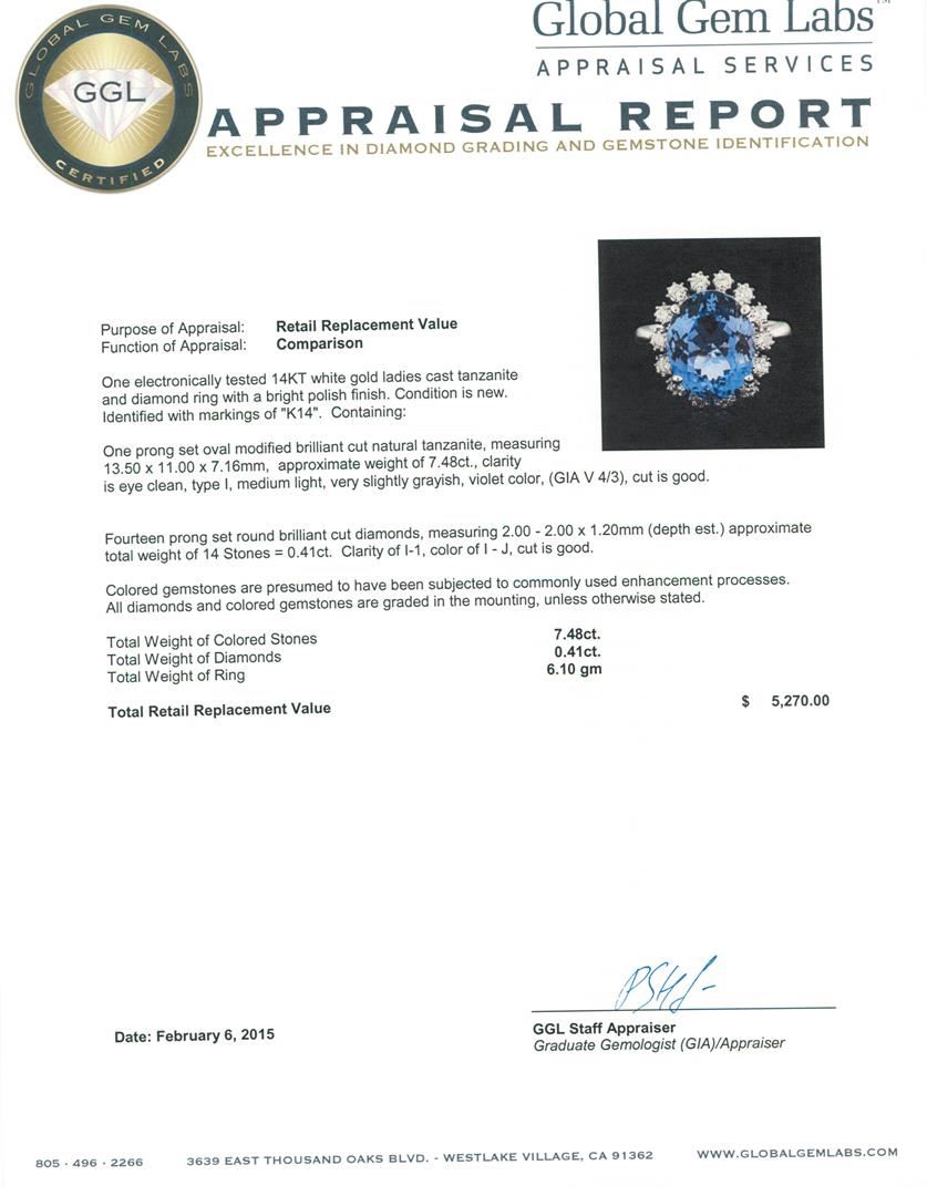 One electronically tested 14KT white gold ladies cast tanzanite and diamond ring with a bright polish finish. Identified with markings of "K14". Condition is new. Containing: One prong set oval modified brilliant cut natural tanzanite, measuring 13.50 x 11.00 x 7.16mm, approximate weight of 7.48ct., clarity is eye clean, type I, medium light, very slightly grayish, violet color, (GIA V 4/3), cut is good. Fourteen prong set round brilliant cut diamonds, measuring 2.00 - 2.00 x 1.20mm (depth est.) approximate total weight of 14 Stones = 0.41ct. Clarity: I-1. Color: I - J, Cut is Good. Colored gemstones are presumed to have been subjected to commonly used enhancement processes. All diamonds and colored gemstones are graded in the mounting, unless otherwise stated. Total Weight of Colored Stones 7.48ct. Total Weight of Diamonds 0.41ct. Total Weight of Ring 6.10 grams. GGL Appraised at $5,270.00.