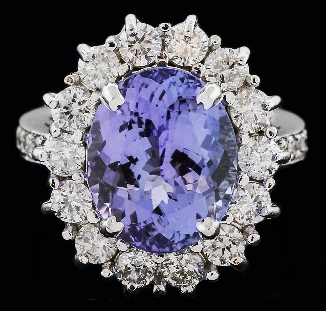 One electronically tested 14KT white gold ladies cast tanzanite and diamond ring with a bright polish finish. Identified with markings of "K14". Condition is new. Containing: One prong set oval modified brilliant cut natural tanzanite, measuring 13.49 x 10.92 x 7.32mm, approximate weight of 7.59ct., clarity is eye clean, type I, medium light, very slightly grayish, violet color, (GIA V 4/3), cut is good. Eight prong set round brilliant cut diamonds, measuring 1.50 - 1.50 x 0.90mm (depth est.) approximate. Total Weight of 8 Stones = 0.10ct. Clarity: SI-1. Color: H - I, Cut is Good. Fourteen prong set round brilliant cut diamonds, measuring 3.00 - 3.00 x 1.80mm (depth est.) approximate. Total Weight of 14 Stones = 1.38ct. Clarity: SI-1 to I-1. Color: H - I, Cut is Good. Colored gemstones are presumed to have been subjected to commonly used enhancement processes. All diamonds and colored gemstones are graded in the mounting, unless otherwise stated. Total Weight of Colored Stones 7.59ct. Total Weight of Diamonds 1.48ct. Total Weight of Ring 12.60 grams. GGL Appraised.
