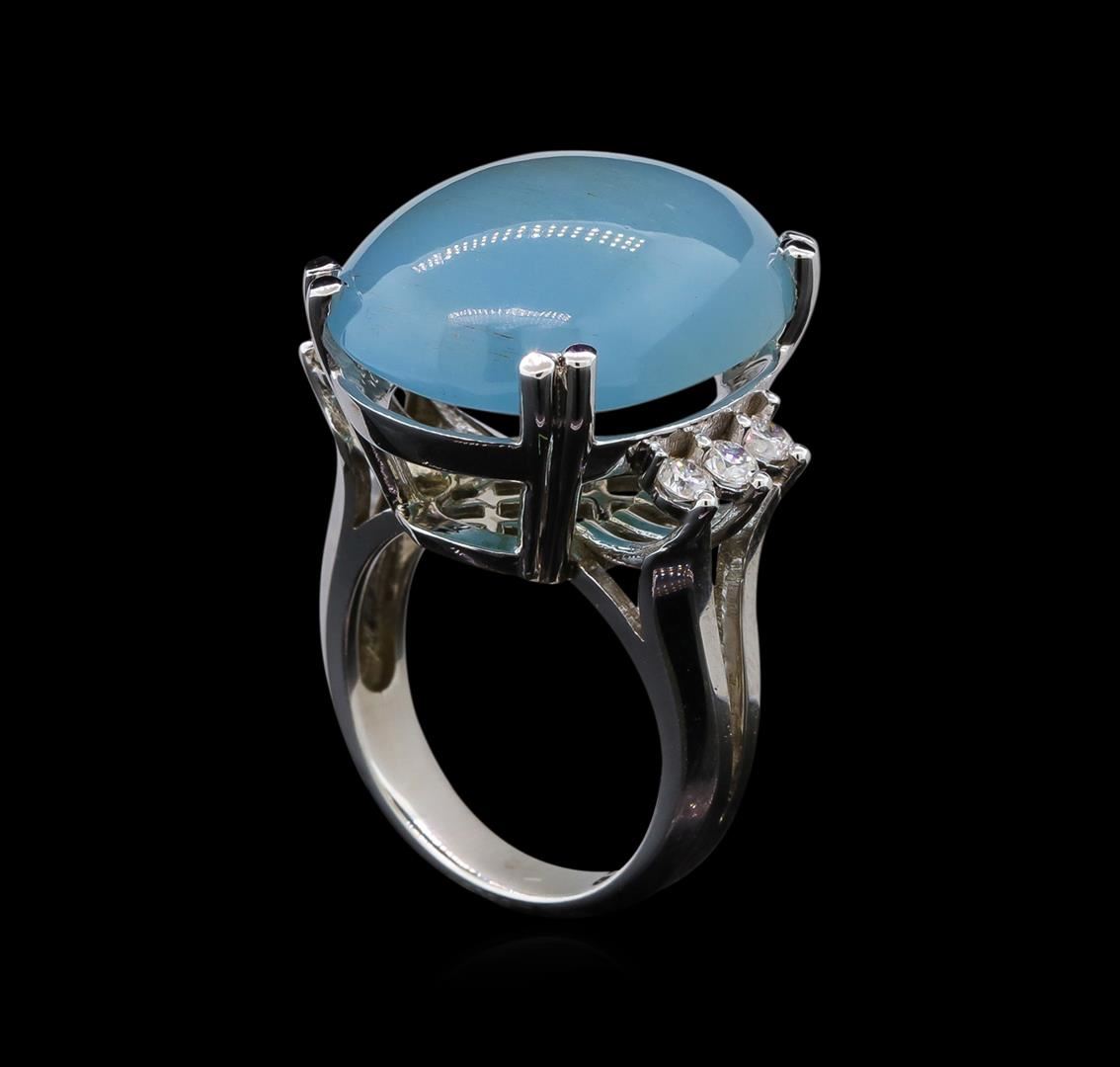 One electronically tested 14KT white gold ladies cast aquamarine and diamond ring with a bright polish finish. Identified with markings of "14K". Condition is new. Containing: One prong set oval cabochon cut natural aquamarine, measuring 22.20 x 16.70 x 10.86mm, approximate weight of 7.60ct., clarity is severely included, type I, medium light, very slightly grayish, blue color, (GIA B 4/3), cut is good. Six prong set round brilliant cut diamonds, measuring 2.50 - 2.50 x 1.50mm (depth est.) approximate total weight of 6 Stones = 0.45ct. Clarity: SI-1 to SI-2. Color: I - J, Cut is Good. Colored gemstones are presumed to have been subjected to commonly used enhancement processes. All diamonds and colored gemstones are graded in the mounting, unless otherwise stated. Total Weight of Colored Stones 7.60ct. Total Weight of Diamonds 0.45ct. Total Weight of Ring 14.90 grams. GGL Appraised at $3,425.00.