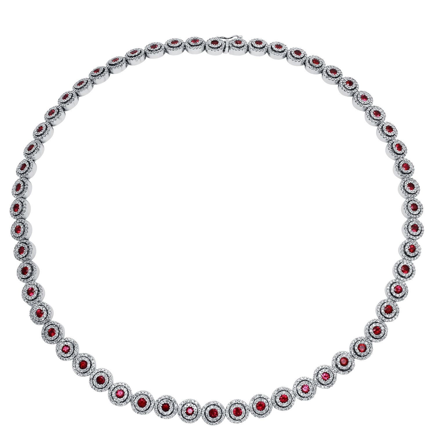 One 14KT White Gold 7.64ctw Ruby and Diamond Necklace. (56) Rubies with a total weight of 7.64cts. (1624) Diamonds with a total weight of 6.54cts with a color of I and clarity of SI-2 to I-1. Total weight of this necklace is 53.78 grams.