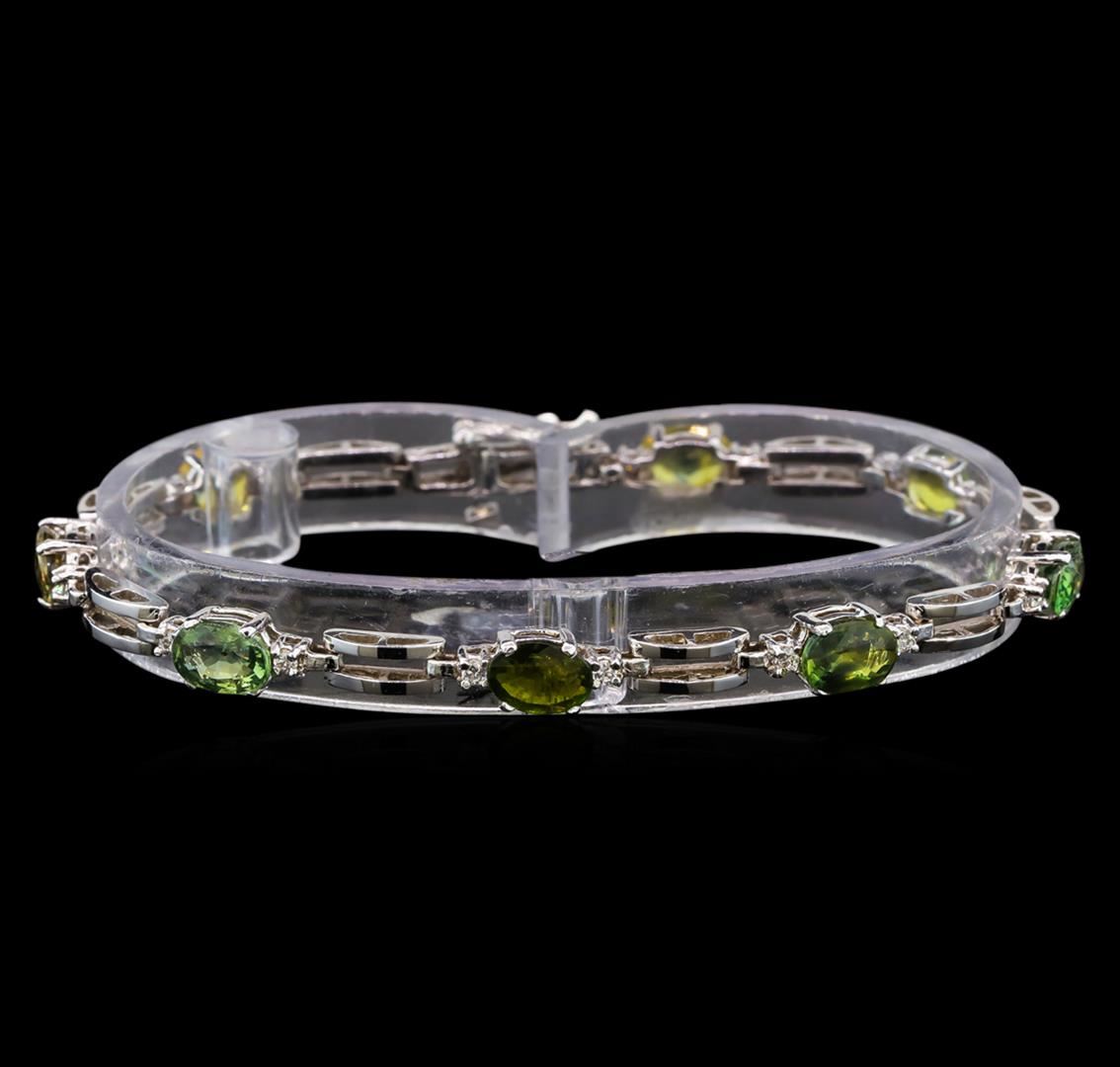 One electronically tested 14KT white gold ladies cast sapphire and diamond bracelet with a hidden box clasp with safety closer with a bright polish finish. Measurements: 6.25" in length. Identified with markings of "14K". Condition is new. Containing: Eight prong set oval modified brilliant cut natural multicolor sapphires, measuring 7.00. x 5.00. x 3.25mm, approximate total weight of 7.68ct., clarity is slightly included, type II, medium light, very slightly grayish, green and yellow color, (GIA V 4/3), cut is good. Sixteen prong set round brilliant cut diamonds, measuring 1.30 - 1.30 x 0.78mm (depth est.) approximate total weight of 16 Stones = 0.13ct. Clarity: SI-1 to SI-2. Color: H - I, Cut is Good. Colored gemstones are presumed to have been subjected to commonly used enhancement processes. All diamonds and colored gemstones are graded in the mounting, unless otherwise stated. Total Weight of Colored Stones 7.68ct. Total Weight of Diamonds 0.13ct. Total Weight of Bracelet 9.40 grams. GGL Appraised at $3,050.00.