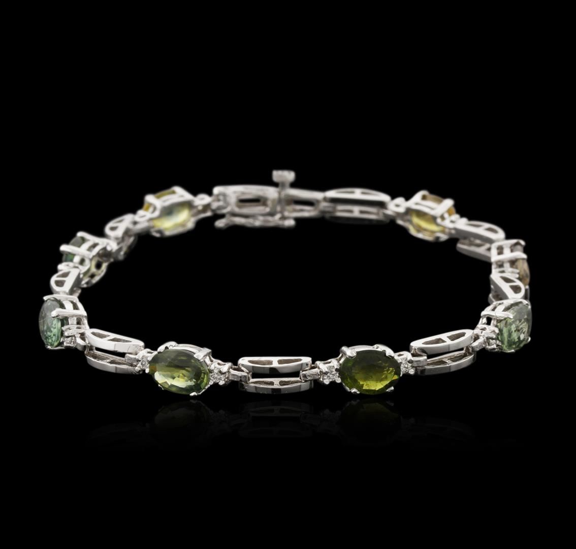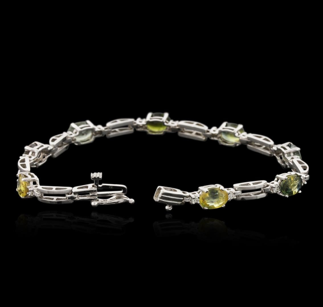 One electronically tested 14KT white gold ladies cast sapphire and diamond bracelet with a hidden box clasp with safety closer with a bright polish finish. Measurements: 6.25" in length. Identified with markings of "14K". Condition is new. Containing: Eight prong set oval modified brilliant cut natural multicolor sapphires, measuring 7.00. x 5.00. x 3.25mm, approximate total weight of 7.68ct., clarity is slightly included, type II, medium light, very slightly grayish, green and yellow color, (GIA V 4/3), cut is good. Sixteen prong set round brilliant cut diamonds, measuring 1.30 - 1.30 x 0.78mm (depth est.) approximate total weight of 16 Stones = 0.13ct. Clarity: SI-1 to SI-2. Color: H - I, Cut is Good. Colored gemstones are presumed to have been subjected to commonly used enhancement processes. All diamonds and colored gemstones are graded in the mounting, unless otherwise stated. Total Weight of Colored Stones 7.68ct. Total Weight of Diamonds 0.13ct. Total Weight of Bracelet 9.40 grams. GGL Appraised at $3,050.00.
