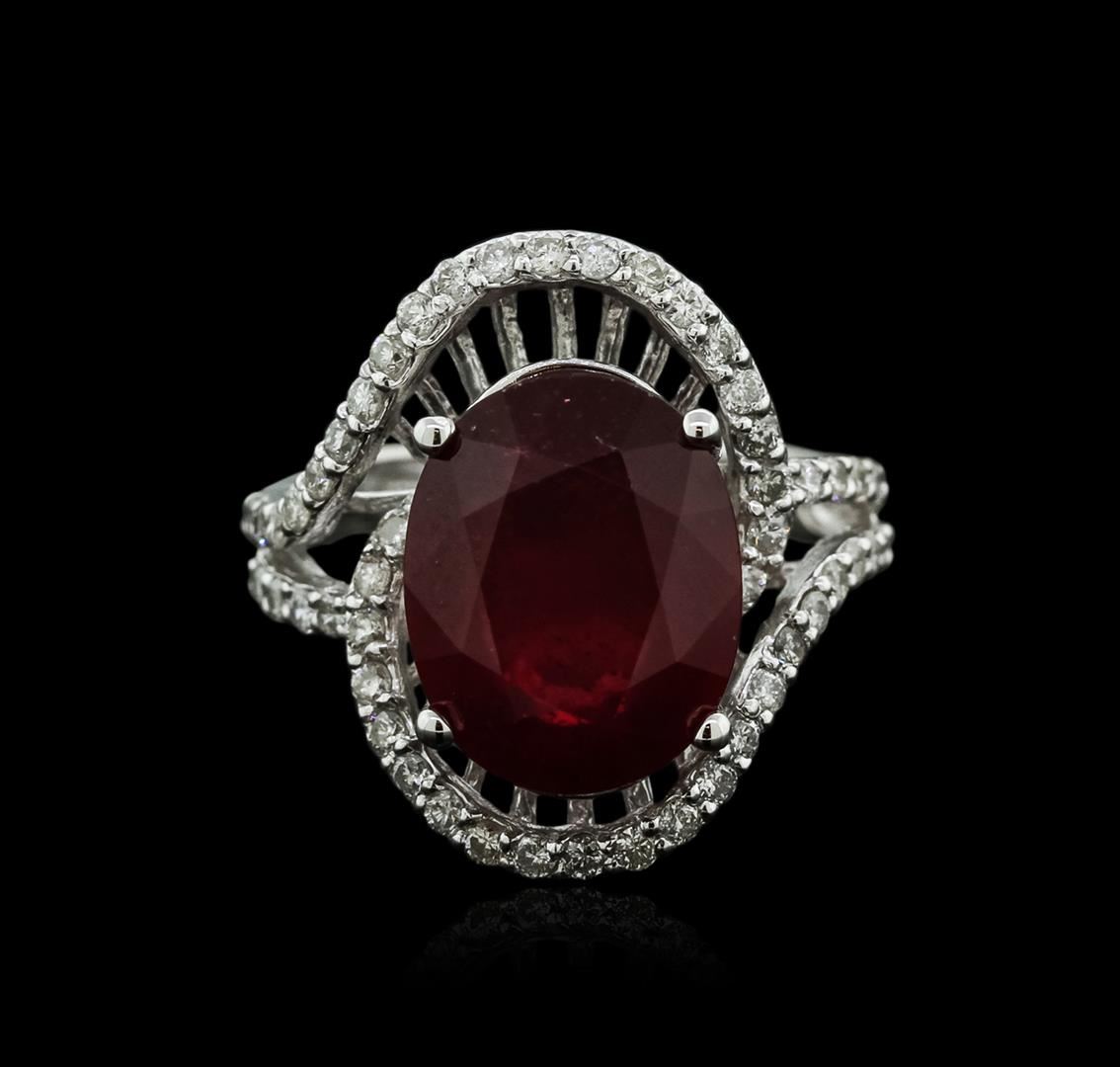One polished, stamped, and tested 14K white gold ring mounted with: 1 oval ruby center stone weighing 7.70 carat, and 50 genuine round diamonds weighing 0.63 carats. This item weighs 6.4 grams, condition is new, excellent workmanship. MAIN GEMSTONE: Variety: Ruby. Species: Natural Corundum. Shape: Oval. Cutting Style: Brilliant Cut Crown Step Cut Pavilion. Measurements: 12.85 x 10.31 x 6.08 mm. Weight: 7.70 carat. Color: Red. Cut Grade: Very Good. Refractive Index: 1.762 - 1.770 DR. Birefringence: 0.008 - 0.010. Hardness: 9. ADJACENT GEMSTONES ON RING: Identity: Natural Diamond. Shape: Round. Cutting Style: Brilliant Cut. Quantity: 50 Diamonds. Measurements: 1.3 - 1.6 mm. Total Weight: 0.63 carats. Clarity Grade: VS2 - SI2. Color Grade: F - H. Refractive Index: 2.418. Hardness: 10. Ruby Weight: 7.70 ct. Total Diamond Weight: 0.63 cts. Weight of Item: 6.4 grams. Gold Content: 14K White Gold. AIGL Appraised at $6,000.00.