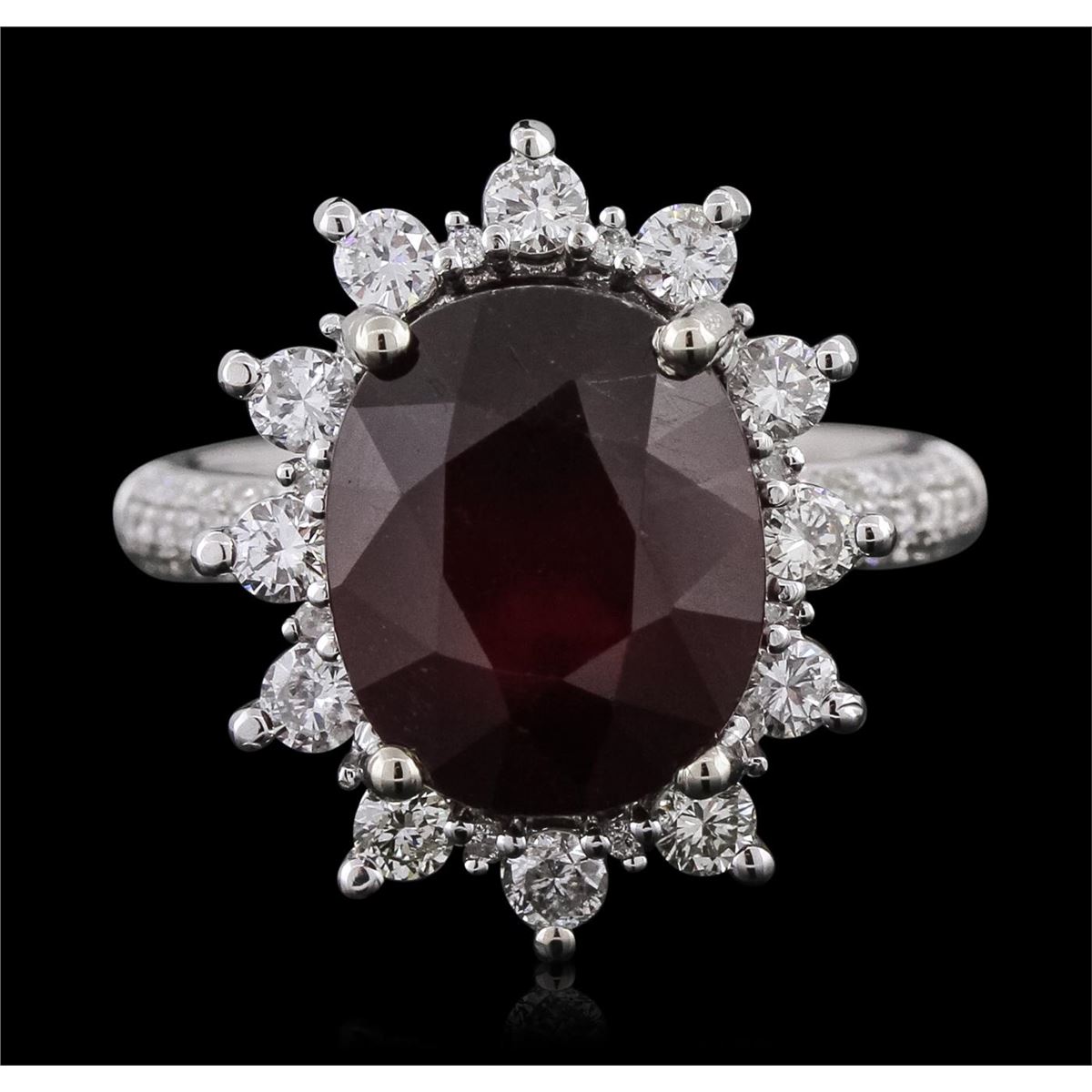 One electronically tested 14KT white gold ladies cast ruby and diamond ring with a bright polish finish. Condition is new, good workmanship. The featured ruby is set within a diamond bezel supported by diamond set shoulders, completed by a two and one-half millimeter wide band. Trademark is PMI. Identified with markings of "14K". Containing: One prong set oval mixed cut natural ruby, measuring 12.20 x 9.90 x 7.20mm, 10%. bulge factor, approximate weight of 7.74ct., clarity is heavily included, type II, dark, very slightly brownish, slightly purplish red color, (GIA slpR 7/3), cut is good. Transmitting light somewhat diffusely, transparent to translucent. Naturally occurring internal & external characteristics are present. Indications of laboratory high temperature heat treatment, with glass & flux additives. Graded in the setting. Ruby has a low tolerance to rhodium plating, repolishing the surface, & ultrasonic cleaning. Twelve prong set round brilliant cut diamonds, measuring 2.50 - 2.50 x 1.50mm (depth est.) approximate. Total Weight of 12 Stones = 0.78ct. The color grade reflects the entire range of color for this group. Graded in the setting. Clarity: SI-1 to I-1. Color: G - J Fifty-Six pav‚ & prong set round brilliant cut diamonds, measuring 1.20 - 1.10 x 0.69mm (depth est.) approximate. Total Weight of 56 Stones = 0.40ct. Graded in the setting. Clarity: SI-2 to I-2. Color: G - I. Total Weight of Colored Stones 7.74ct. Total Weight of Diamonds 1.18ct. Total Weight of Ring 7.16 grams. AIG Appraised at $6,180.00.
