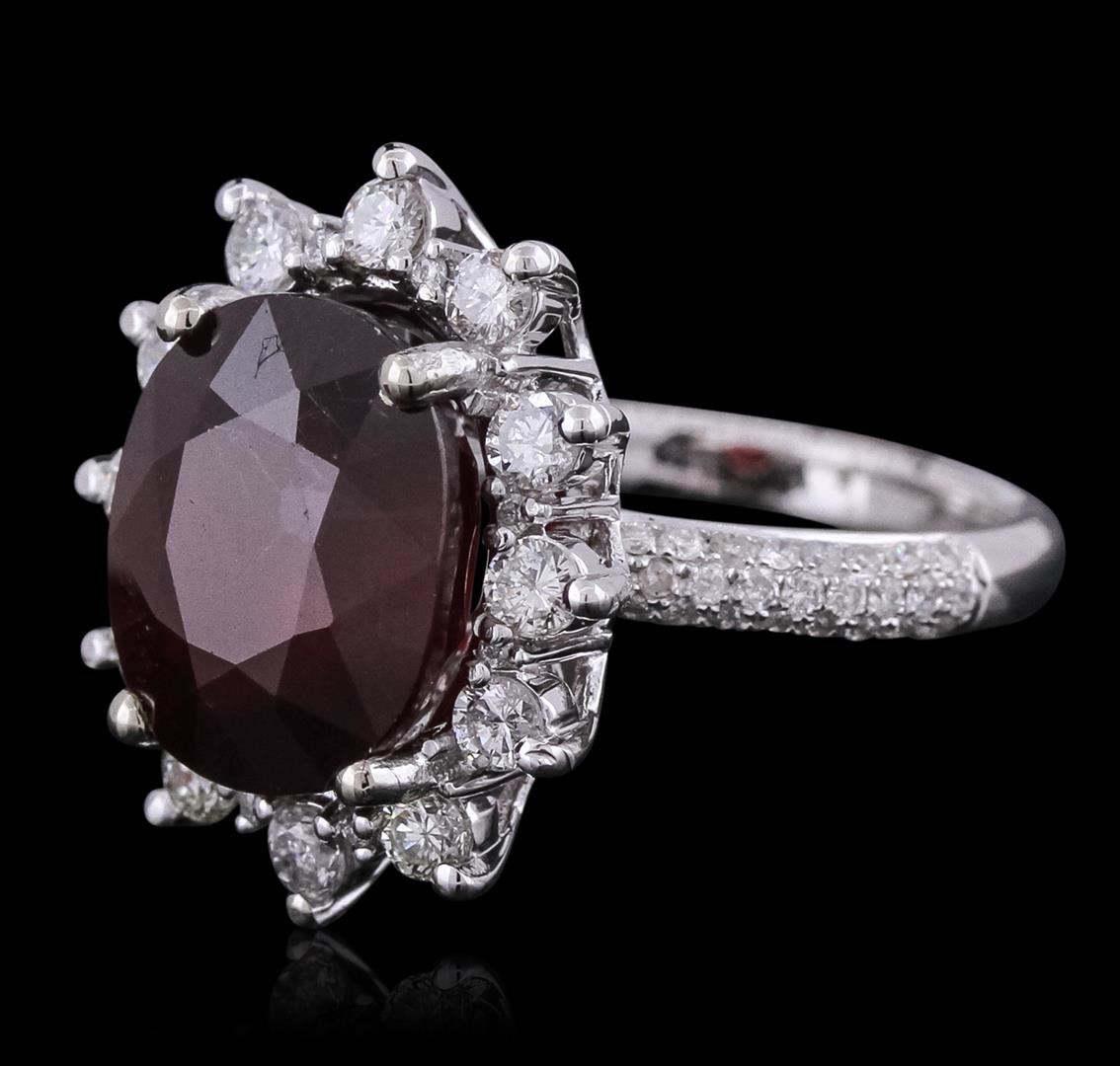 One electronically tested 14KT white gold ladies cast ruby and diamond ring with a bright polish finish. Condition is new, good workmanship. The featured ruby is set within a diamond bezel supported by diamond set shoulders, completed by a two and one-half millimeter wide band. Trademark is PMI. Identified with markings of "14K". Containing: One prong set oval mixed cut natural ruby, measuring 12.20 x 9.90 x 7.20mm, 10%. bulge factor, approximate weight of 7.74ct., clarity is heavily included, type II, dark, very slightly brownish, slightly purplish red color, (GIA slpR 7/3), cut is good. Transmitting light somewhat diffusely, transparent to translucent. Naturally occurring internal & external characteristics are present. Indications of laboratory high temperature heat treatment, with glass & flux additives. Graded in the setting. Ruby has a low tolerance to rhodium plating, repolishing the surface, & ultrasonic cleaning. Twelve prong set round brilliant cut diamonds, measuring 2.50 - 2.50 x 1.50mm (depth est.) approximate. Total Weight of 12 Stones = 0.78ct. The color grade reflects the entire range of color for this group. Graded in the setting. Clarity: SI-1 to I-1. Color: G - J Fifty-Six pav, & prong set round brilliant cut diamonds, measuring 1.20 - 1.10 x 0.69mm (depth est.) approximate. Total Weight of 56 Stones = 0.40ct. Graded in the setting. Clarity: SI-2 to I-2. Color: G - I. Total Weight of Colored Stones 7.74ct. Total Weight of Diamonds 1.18ct. Total Weight of Ring 7.16 grams. AIG Appraised at $6,180.00.