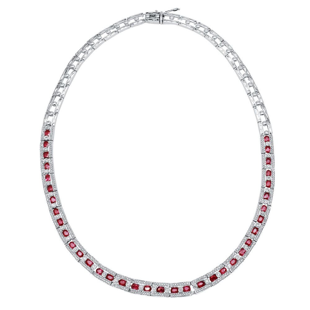 One 14KT White Gold 7.76ctw Ruby and Diamond Necklace. (36) Rubies with a total weight of 7.76cts. (372) Diamonds with a total weight of 1.67cts with a color of I and clarity of I-1. Total weight of this necklace is 42.7 grams.