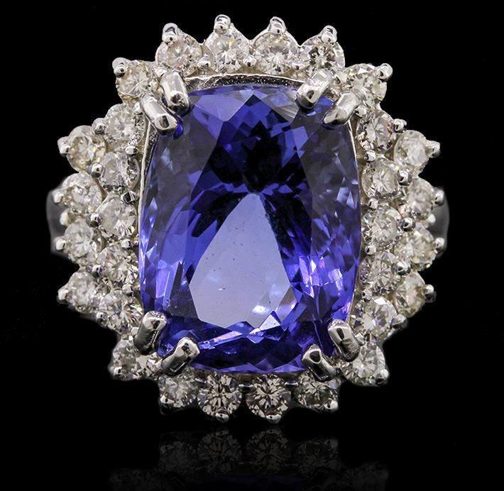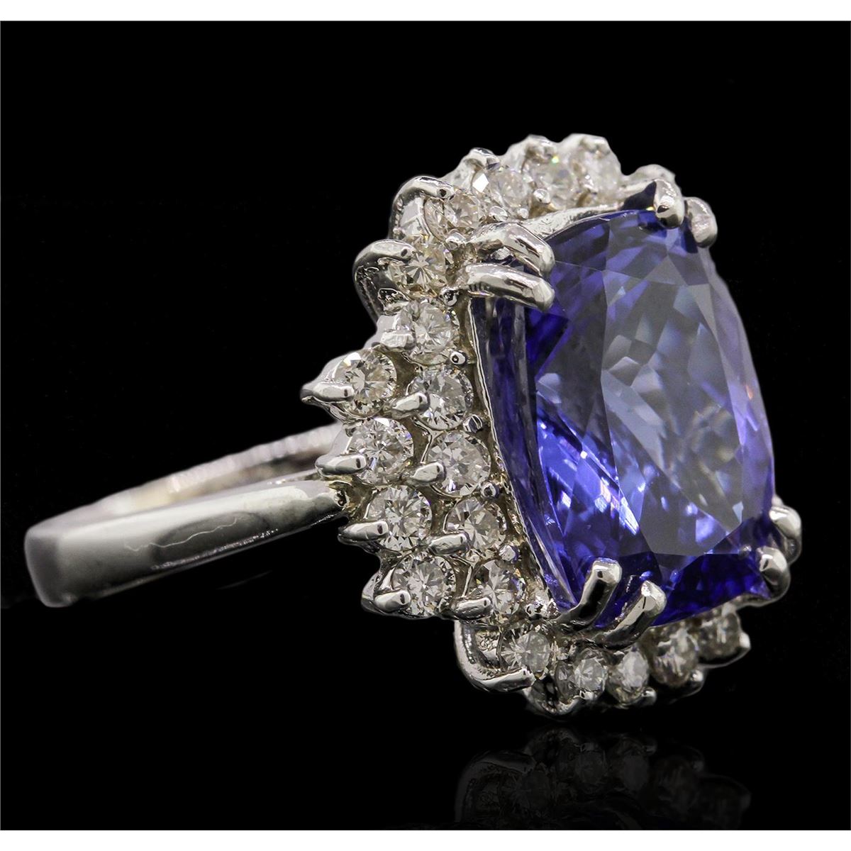 One electronically tested 14KT white gold Ladies combination cast & assembled ring with a bright polish finish. Condition is new. Identified with markings of "K14". Containing: One prong set rectangular cushion modified brilliant cut natural tanzanite, measuring 13.60 x 10.40 x 7.00mm, approximate weight of 7.79ct., clarity is eye clean, type I, medium, moderately strong, violetish blue color, (GIA vB 5/4), cut is very good. Colored gemstones are presumed to have been subjected to commonly used color/clarity enhancement processes. Thirty prong set round brilliant cut diamonds, measuring 2.40 - 2.40 x 1.44mm (depth est.) approximate. Total Weight of 30 Stones = 1.52ct. Clarity: I-1 to I-2. Color: K - L, Cut is Good. Total Weight of Colored Stones 7.79ct. Total Weight of Diamonds 1.52ct. Total Weight of Ring 8.40 grams. GGL Appraised at $15,260.00.