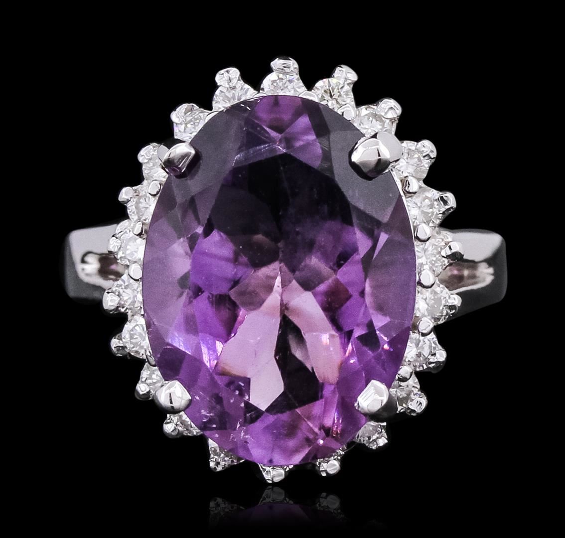 One electronically tested 14KT white gold ladies cast amethyst and diamond ring with a bright polish finish. The featured amethyst is set within a diamond bezel, completed by a two and one-half millimeter wide band. Identified with markings of "14K". Condition is new, good workmanship. Containing: One prong set oval mixed cut natural amethyst, measuring 15.85 x 11.80 x 7.25mm, 6% bulge factor, approximate weight of 7.81ct., clarity is slightly included, type II, medium dark, very slightly grayish, reddish purple color, (GIA rP 6/3), cut is good. Transmitting light with a minimum of distortion, transparent. Naturally occurring internal & external characteristics are present. Colored Stone Grading Report attached. Graded in the setting. Twenty prong set round brilliant cut diamonds, measuring 2.10 - 2.00 x 1.23mm (depth est.) approximate total weight of 20 Stones = 0.73ct. Graded in the setting. Clarity: SI-1 to I-1. Color: H - J. Total Weight of Colored Stones 7.81ct. Total Weight of Diamonds 0.73ct. Total Weight of Ring 8.24 grams. AIG Appraised at $3,630.00.