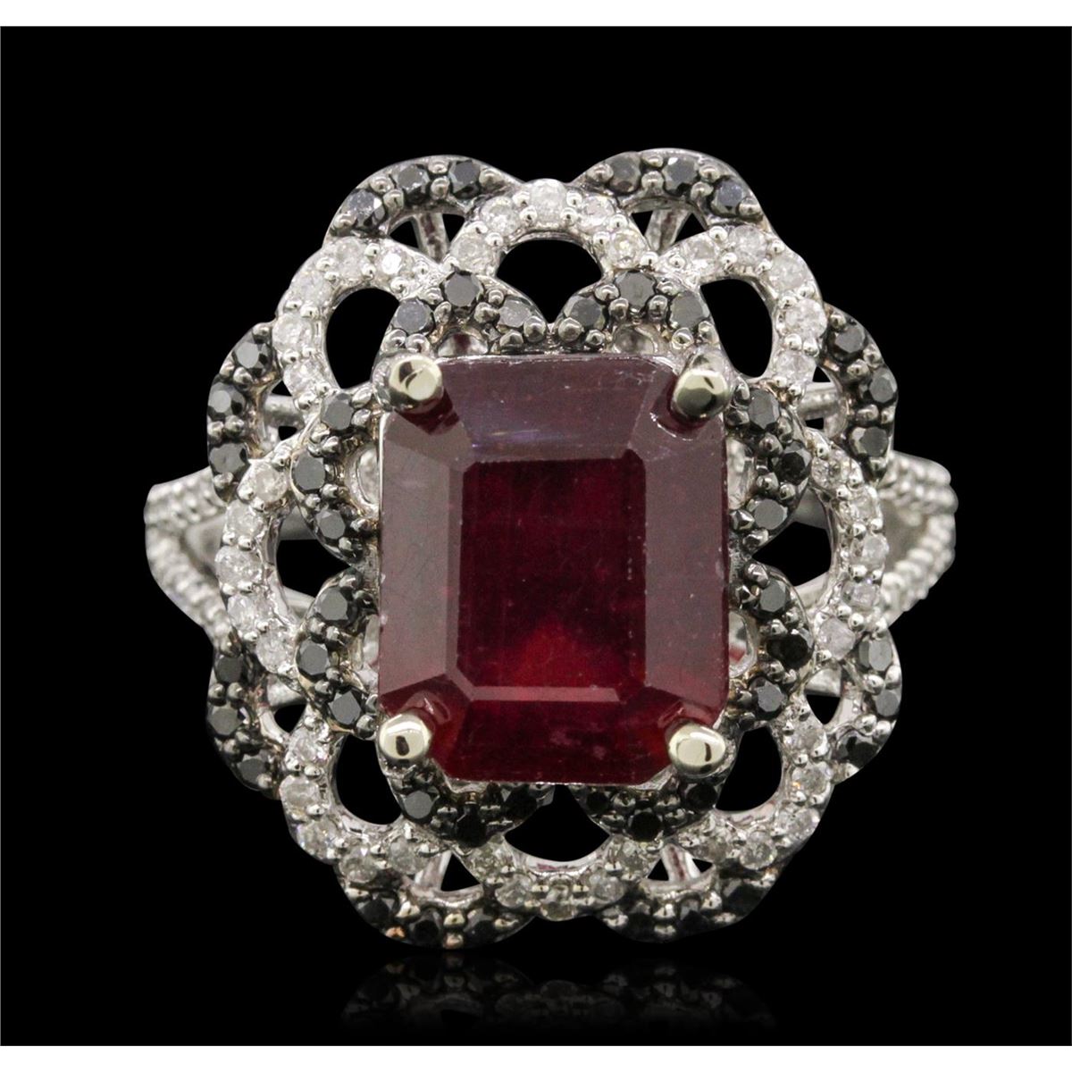 One electronically tested 14KT white gold ladies cast ruby and diamond ring. Condition is new, good workmanship. The featured ruby is set within a stylized black and white diamond lattice supported by white diamond set split shoulders, completed by a two millimeter wide band. Bright and anodized finish. Trademark is PMI. Identified with markings of "14K". Containing: One prong set rectangular step cut natural ruby, measuring 11.00 x 9.00 x 6.10mm, 8%. bulge factor, approximate weight of 7.83ct., clarity is heavily included, type II, dark, very slightly brownish, slightly purplish red color, (GIA slpR 7/3), cut is good. Transmitting light somewhat diffusely, transparent to translucent. Naturally occurring internal & external characteristics are present. Indications of laboratory high temperature heat treatment, with glass & flux additives. Graded in the setting. Ruby has a low tolerance to rhodium plating, repolishing the surface, & ultrasonic cleaning. Forty-Eight prong set round brilliant cut diamonds, measuring 1.60 - 1.50 x 0.93mm (depth est.) approximate. Total Weight of 48 Stones = 0.75ct. Indications of multiple laboratory enhancements. The specific gravity of black diamond is 3.120 to 3.165. Diamond tester results are non-reactive. Graded in the setting. Clarity D‚class‚. Color: Fancy Black; Irradiated. Seventy-Two prong set round brilliant cut diamonds, measuring 1.60 - 1.50 x 0.93mm (depth est.) approximate. Total Weight of 72 Stones = 1.08ct. Graded in the setting. Clarity: I-1 to I-3. Color: G - I. Total Weight of Colored Stones 7.83ct. Total Weight of Diamonds 1.83ct. Total Weight of Ring 7.24 grams. AIG Appraised at $5,825.00.