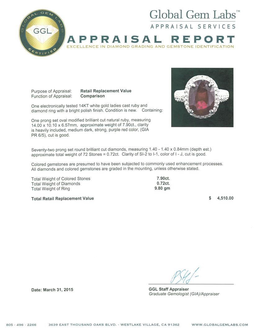 One electronically tested 14KT white gold ladies cast ruby and diamond ring with a bright polish finish. Condition is new. Containing: One prong set oval modified brilliant cut natural ruby, measuring 14.00 x 10.10 x 6.57mm, approximate weight of 7.90ct., clarity is heavily included, medium dark, strong, purple red color, (GIA PR 6/5), cut is good. Seventy-Two prong set round brilliant cut diamonds, measuring 1.40 - 1.40 x 0.84mm (depth est.) approximate total weight of 72 Stones = 0.72ct. Clarity: SI-2 to I-1. Color: I - J, Cut is Good. Colored gemstones are presumed to have been subjected to commonly used enhancement processes. All diamonds and colored gemstones are graded in the mounting, unless otherwise stated. Total Weight of Colored Stones 7.90ct. Total Weight of Diamonds 0.72ct. Total Weight of Ring 9.80 grams. GGL Appraised at $4,510.00.