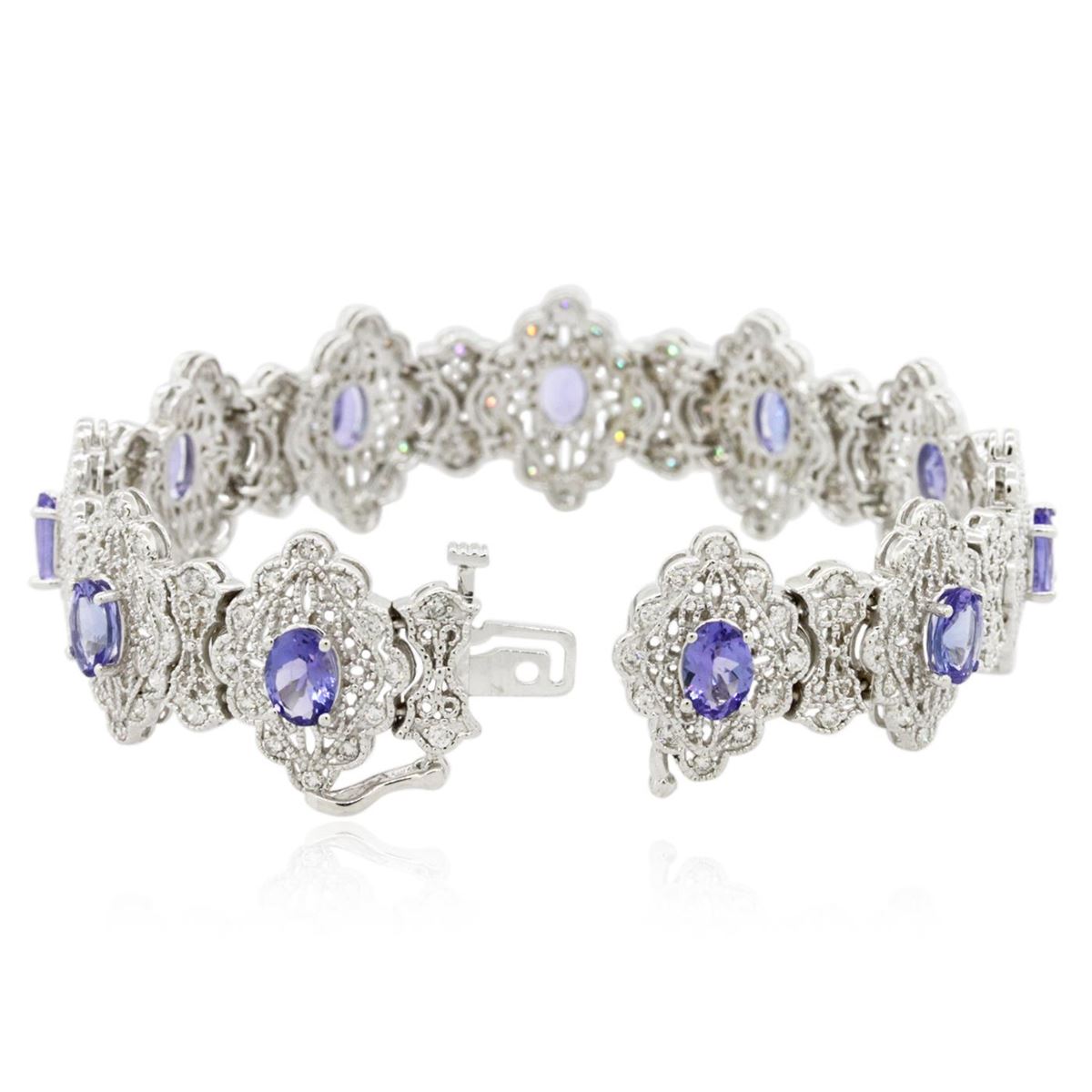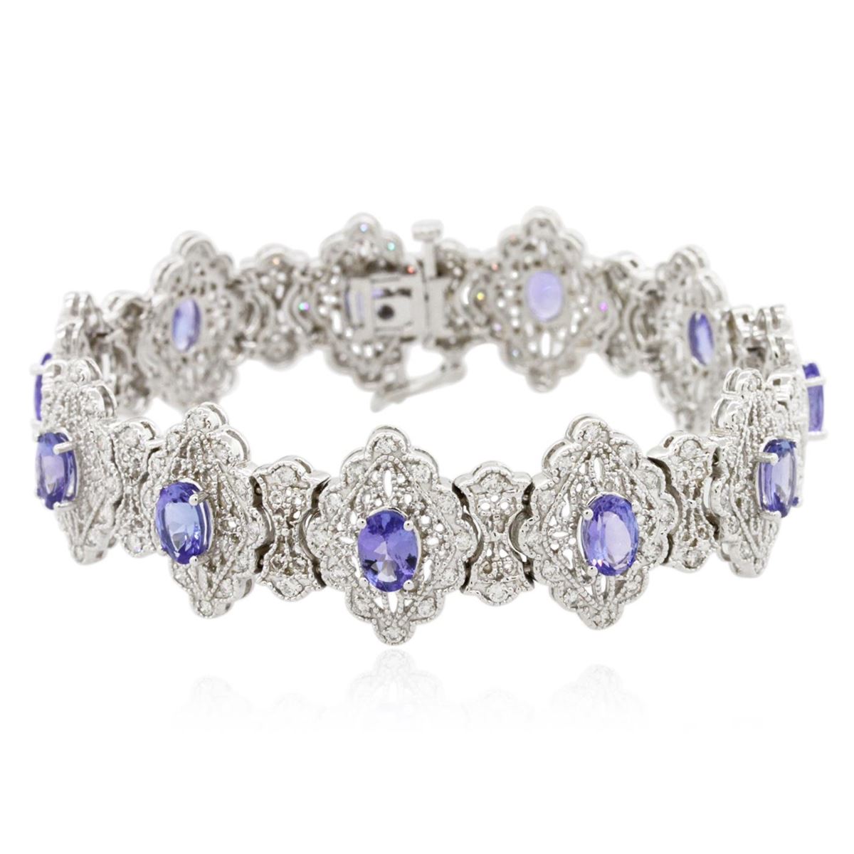 One electronically tested 14KT white gold ladies cast tanzanite and diamond bracelet with a hidden box clasp with a bright polish finish. Measurements: 7.25" in length Condition is new. Containing: Eleven prong set oval modified brilliant cut natural tanzanites, measuring 6.80 x 4.80 x 3.12mm, approximate total weight of 7.92ct., clarity is eye clean, type I, medium light, very slightly grayish, violet color, (GIA V 4/3), cut is good. One Hundred Fifty-Four prong set round brilliant cut diamonds, measuring 1.30 - 1.30 x 0.78mm (depth est.) approximate total weight of 154 Stones = 1.23ct. Clarity: SI-1 to SI-2. Color: I - J, Cut is Good. Colored gemstones are presumed to have been subjected to commonly used enhancement processes. All diamonds and colored gemstones are graded in the mounting, unless otherwise stated. Total Weight of Colored Stones 7.92ct. Total Weight of Diamonds 1.23ct. Total Weight of Bracelet 32.60 grams. GGL Appraised at $14,790.00.