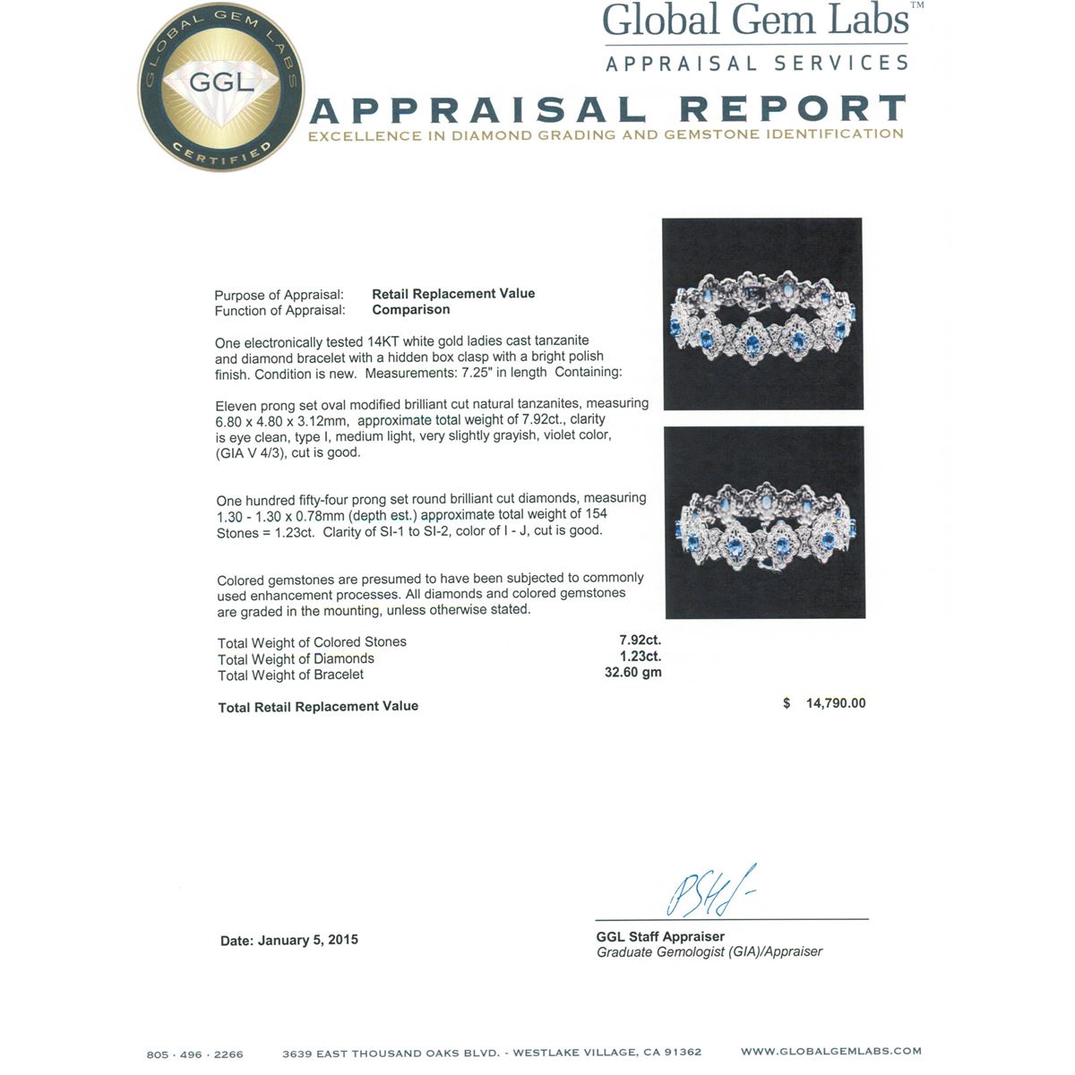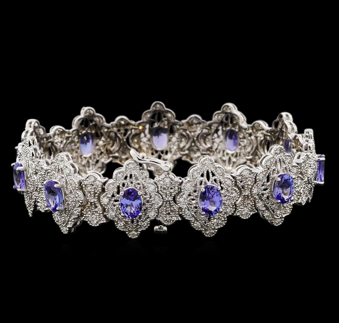 One electronically tested 14KT white gold ladies cast tanzanite and diamond bracelet with a hidden box clasp with a bright polish finish. Measurements: 7.25" in length Condition is new. Containing: Eleven prong set oval modified brilliant cut natural tanzanites, measuring 6.80 x 4.80 x 3.12mm, approximate total weight of 7.92ct., clarity is eye clean, type I, medium light, very slightly grayish, violet color, (GIA V 4/3), cut is good. One Hundred Fifty-Four prong set round brilliant cut diamonds, measuring 1.30 - 1.30 x 0.78mm (depth est.) approximate total weight of 154 Stones = 1.23ct. Clarity: SI-1 to SI-2. Color: I - J, Cut is Good. Colored gemstones are presumed to have been subjected to commonly used enhancement processes. All diamonds and colored gemstones are graded in the mounting, unless otherwise stated. Total Weight of Colored Stones 7.92ct. Total Weight of Diamonds 1.23ct. Total Weight of Bracelet 32.60 grams. GGL Appraised at $14,790.00.