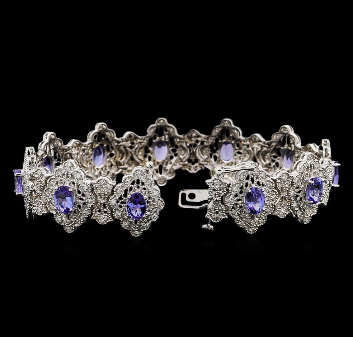 One electronically tested 14KT white gold ladies cast tanzanite and diamond bracelet with a hidden box clasp with a bright polish finish. Measurements: 7.25" in length Condition is new. Containing: Eleven prong set oval modified brilliant cut natural tanzanites, measuring 6.80 x 4.80 x 3.12mm, approximate total weight of 7.92ct., clarity is eye clean, type I, medium light, very slightly grayish, violet color, (GIA V 4/3), cut is good. One Hundred Fifty-Four prong set round brilliant cut diamonds, measuring 1.30 - 1.30 x 0.78mm (depth est.) approximate total weight of 154 Stones = 1.23ct. Clarity: SI-1 to SI-2. Color: I - J, Cut is Good. Colored gemstones are presumed to have been subjected to commonly used enhancement processes. All diamonds and colored gemstones are graded in the mounting, unless otherwise stated. Total Weight of Colored Stones 7.92ct. Total Weight of Diamonds 1.23ct. Total Weight of Bracelet 32.60 grams. GGL Appraised at $14,790.00.