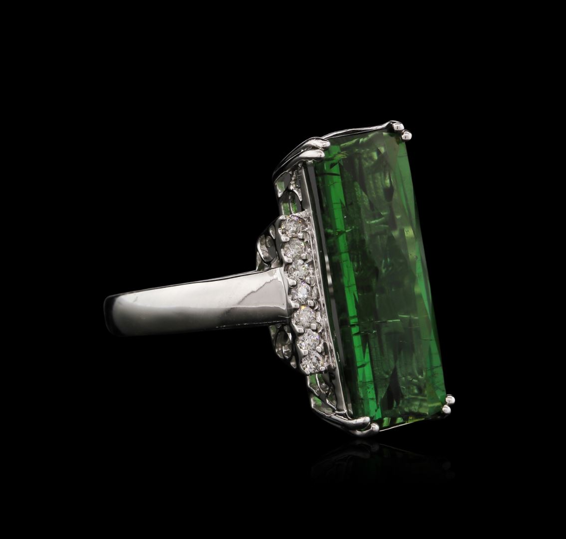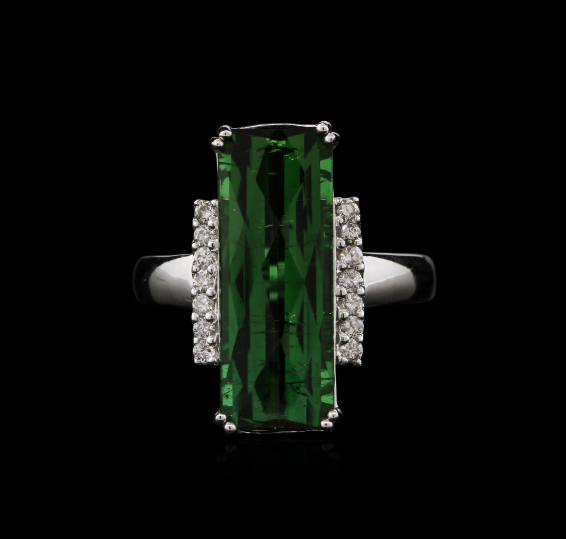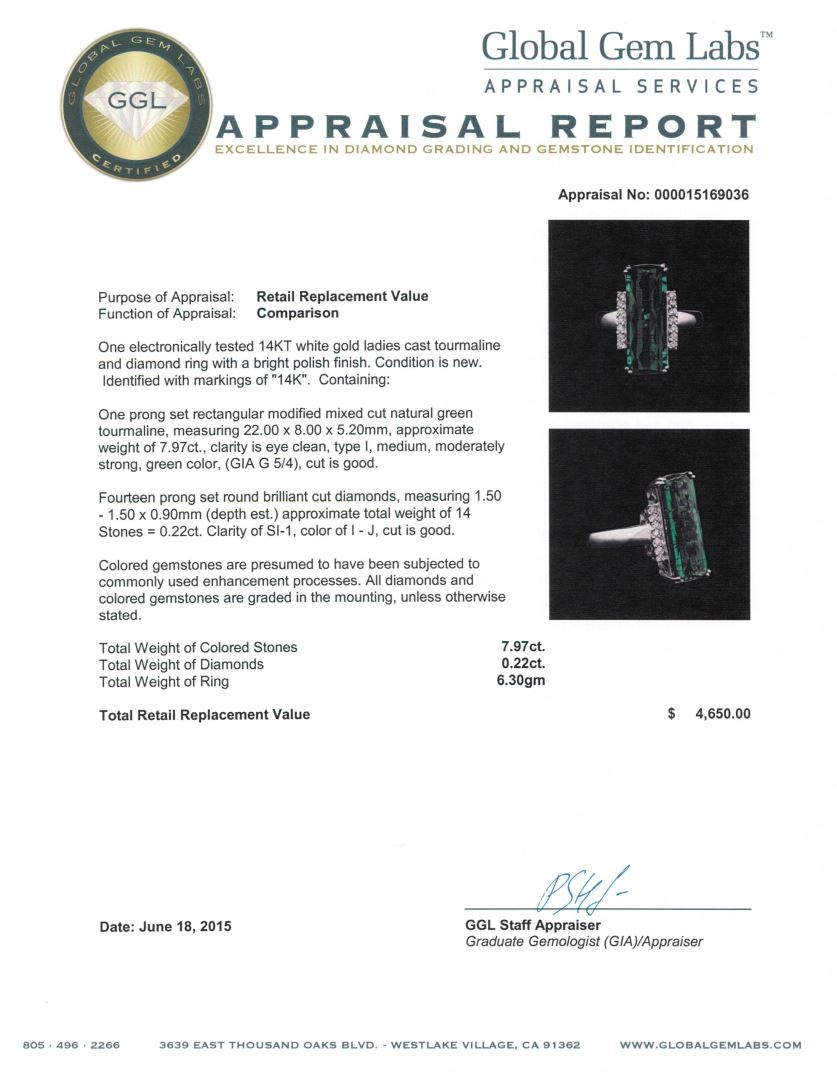 One electronically tested 14KT white gold ladies cast tourmaline and diamond ring with a bright polish finish. Identified with markings of "14K". Condition is new. Containing: One prong set rectangular modified mixed cut natural green tourmaline, measuring 22.00. x 8.00. x 5.20mm, approximate weight of 7.97ct., clarity is eye clean, type I, medium, moderately strong, green color, (GIA G 5/4), cut is good. Fourteen prong set round brilliant cut diamonds, measuring 1.50 - 1.50 x 0.90mm (depth est.) approximate total weight of 14 Stones = 0.22ct. Clarity: SI-1. Color: I - J, Cut is Good. Colored gemstones are presumed to have been subjected to commonly used enhancement processes. All diamonds and colored gemstones are graded in the mounting, unless otherwise stated. Total Weight of Colored Stones 7.97ct. Total Weight of Diamonds 0.22ct. Total Weight of Ring 6.30 grams. GGL Appraised at $4,650.00.
