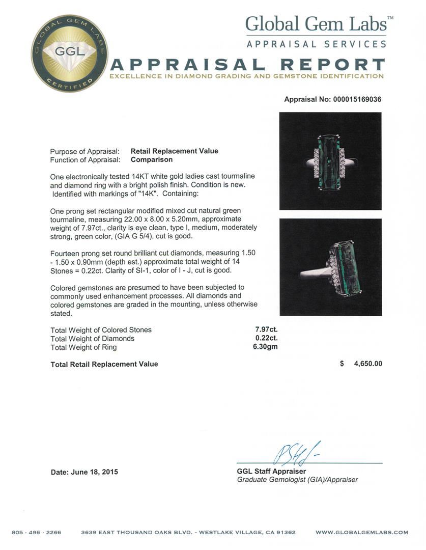 One electronically tested 14KT white gold ladies cast tourmaline and diamond ring with a bright polish finish. Identified with markings of "14K". Condition is new. Containing: One prong set rectangular modified mixed cut natural green tourmaline, measuring 22.00. x 8.00. x 5.20mm, approximate weight of 7.97ct., clarity is eye clean, type I, medium, moderately strong, green color, (GIA G 5/4), cut is good. Fourteen prong set round brilliant cut diamonds, measuring 1.50 - 1.50 x 0.90mm (depth est.) approximate total weight of 14 Stones = 0.22ct. Clarity: SI-1. Color: I - J, Cut is Good. Colored gemstones are presumed to have been subjected to commonly used enhancement processes. All diamonds and colored gemstones are graded in the mounting, unless otherwise stated. Total Weight of Colored Stones 7.97ct. Total Weight of Diamonds 0.22ct. Total Weight of Ring 6.30 grams. GGL Appraised at $4,650.00.