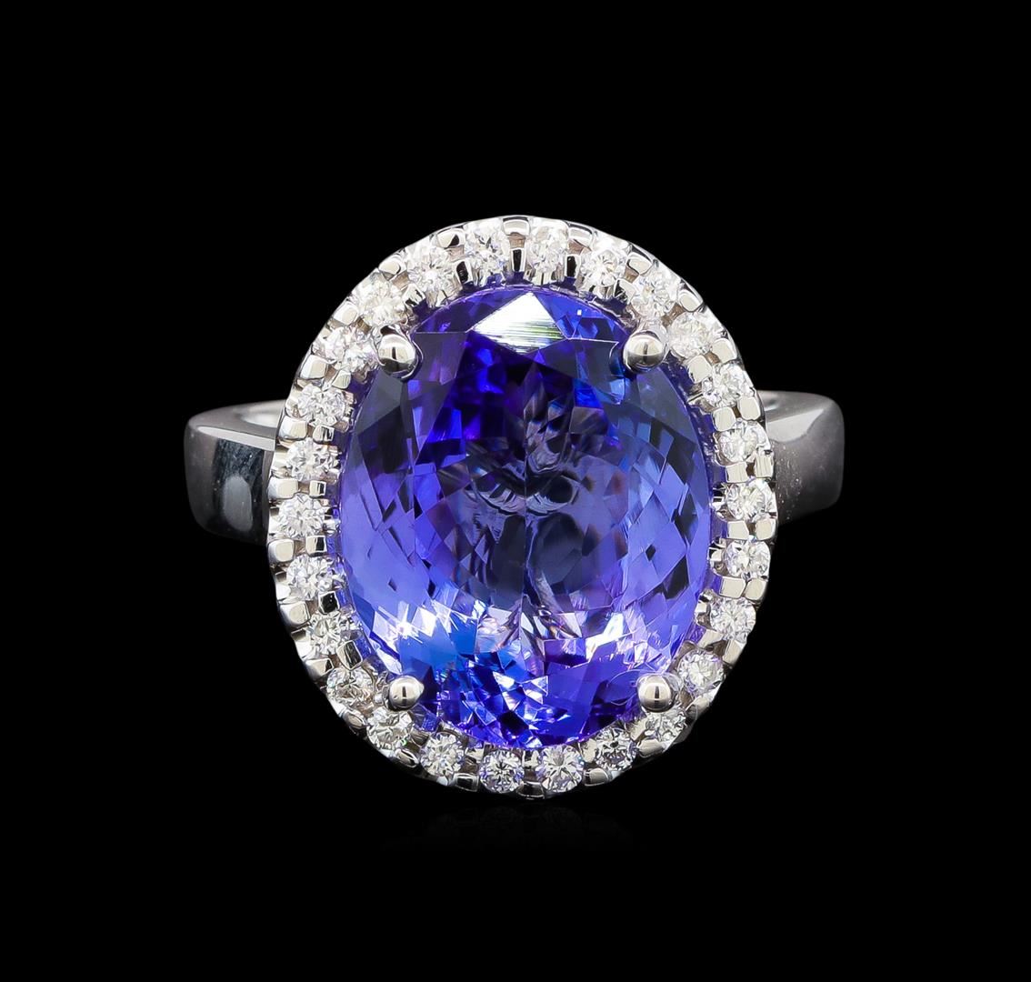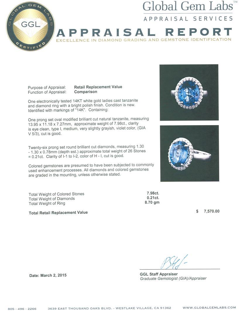 One electronically tested 14KT white gold ladies cast tanzanite and diamond ring with a bright polish finish. Identified with markings of "14K". Condition is new. Containing: One prong set oval modified brilliant cut natural tanzanite, measuring 13.95 x 11.18 x 7.27mm, approximate weight of 7.98ct., clarity is eye clean, type I, medium, very slightly grayish, violet color, (GIA V 5/3), cut is good. Twenty-Six prong set round brilliant cut diamonds, measuring 1.30 - 1.30 x 0.78mm (depth est.) approximate total weight of 26 Stones = 0.21ct. Clarity: I-1 to I-2. Color: H - I, Cut is Good. Colored gemstones are presumed to have been subjected to commonly used enhancement processes. All diamonds and colored gemstones are graded in the mounting, unless otherwise stated. Total Weight of Colored Stones 7.98ct. Total Weight of Diamonds 0.21ct. Total Weight of Ring 8.70 grams. GGL Appraised at $7,570.00.