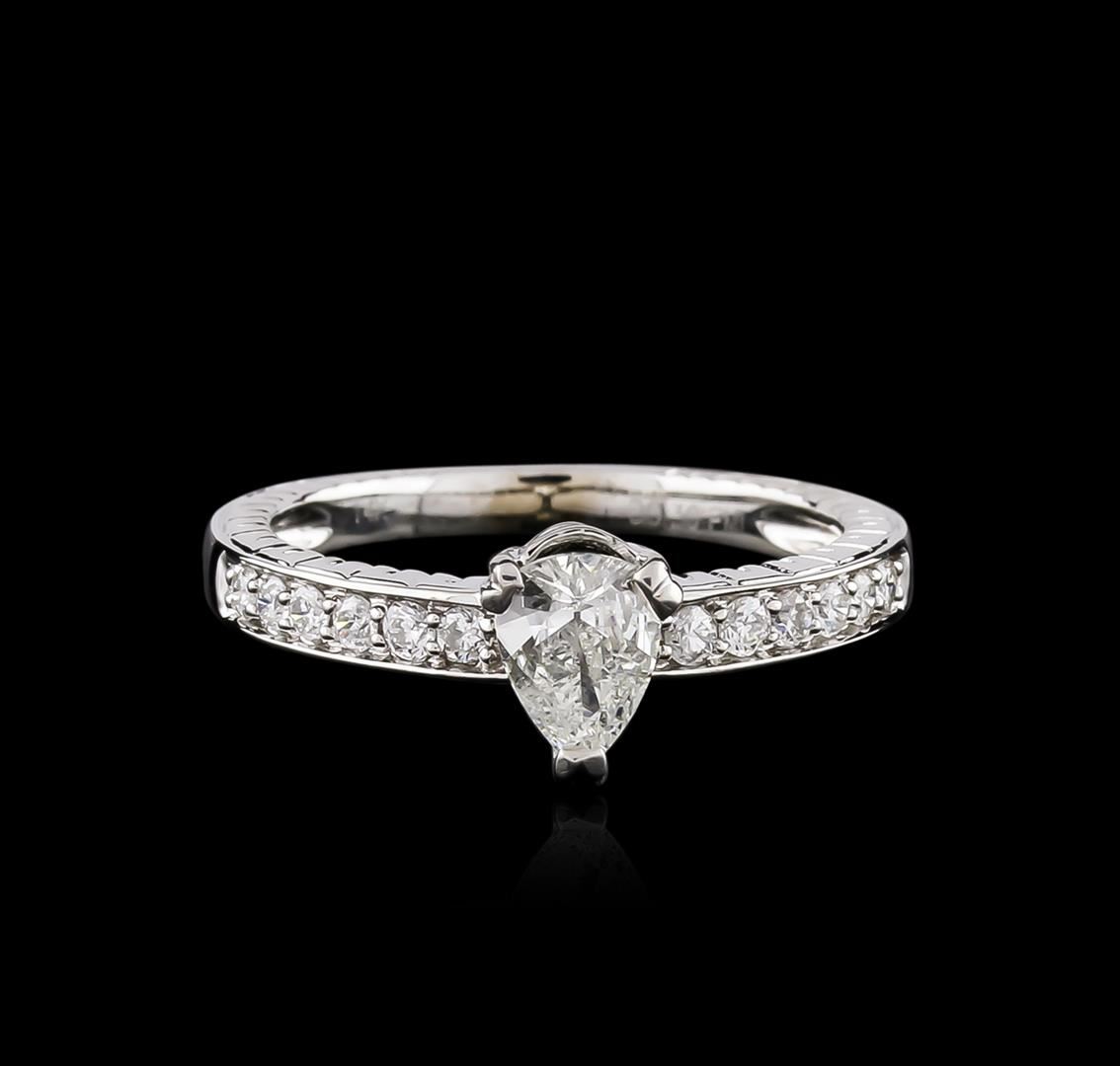 One electronically tested 14KT white gold ladies cast diamond ring. Good workmanship. The featured diamond is supported by diamond set shoulders and completed by a two millimeter wide band. Bright and patterned finish. Identified with markings of "14K". Total weight of diamonds: 0.74cts. Total weight of ring: 3.22gms. AIG Appraised at $4,990.00.