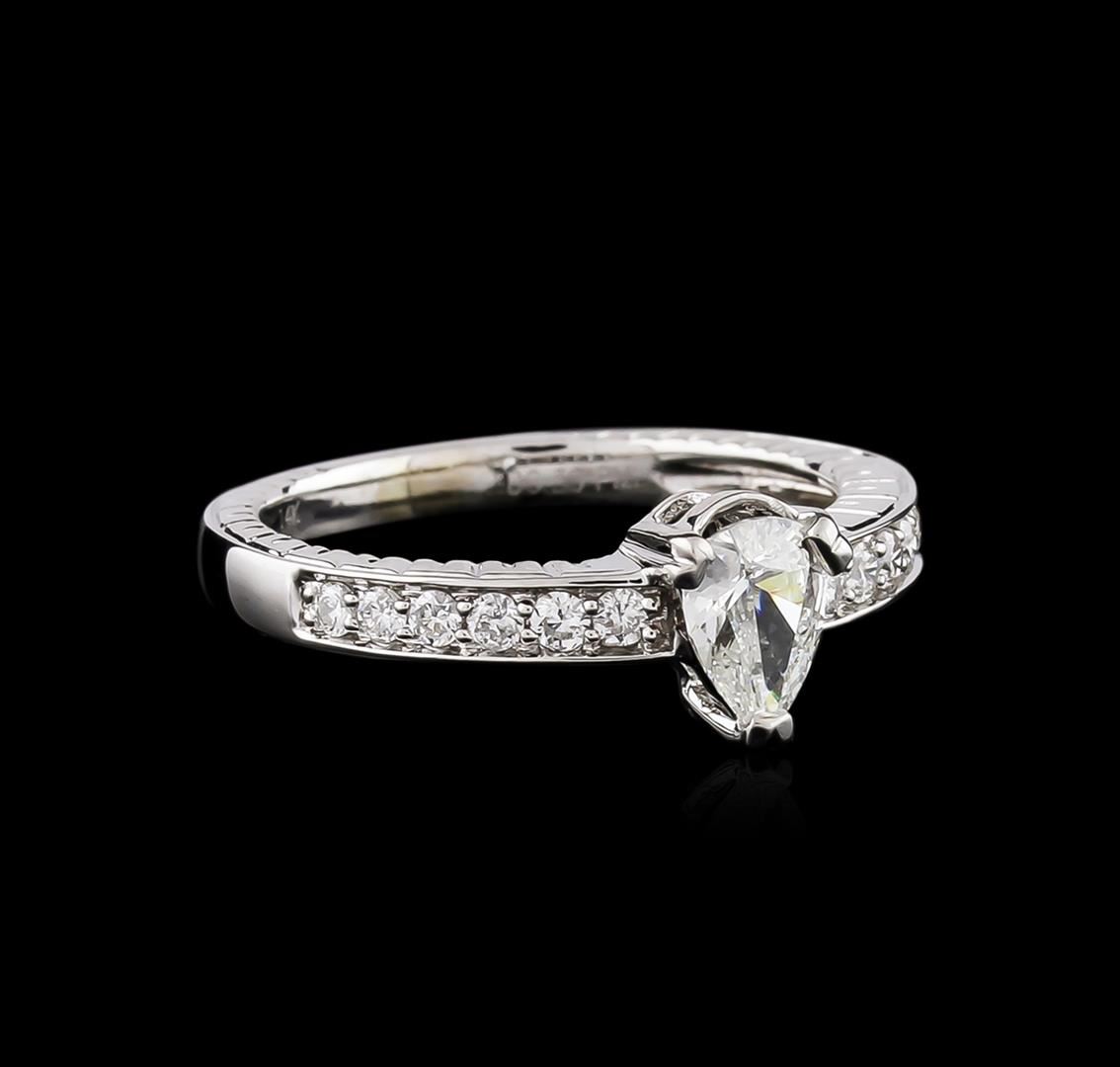 One electronically tested 14KT white gold ladies cast diamond ring. Good workmanship. The featured diamond is supported by diamond set shoulders and completed by a two millimeter wide band. Bright and patterned finish. Identified with markings of "14K". Total weight of diamonds: 0.74cts. Total weight of ring: 3.22gms. AIG Appraised at $4,990.00.