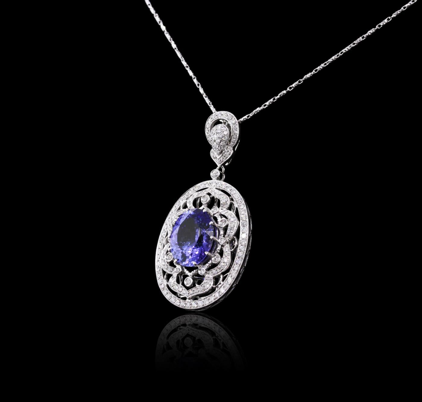 One electronically tested 14KT white gold ladies combination cast & assembled tanzanite and diamond pendant & chain 16.0" long, fancy link with a lobster claw clasp with a bright polish finish. Identified with markings of "585". Condition is new. Containing: One prong set oval modified brilliant cut natural tanzanite, measuring 14.20 x 11.10 x 7.22mm, approximate weight of 8.01ct., clarity is eye clean, type I, medium, moderately strong, bluish violet color, (GIA bV 5/4), cut is very good. One Hundred Fifty-Two prong set round brilliant cut diamonds, measuring 1.30 - 1.30 x 0.78mm (depth est.) approximate total weight of 152 Stones = 1.22ct. Clarity: I-1 to I-2. Color: H - I, Cut is Good. Colored gemstones are presumed to have been subjected to commonly used enhancement processes. All diamonds and colored gemstones are graded in the mounting, unless otherwise stated. Total Weight of Colored Stones 8.01ct. Total Weight of Diamonds 1.22ct. Total Weight of Pendant & Chain 13.10 grams. GGL Appraised at $13,905.00.