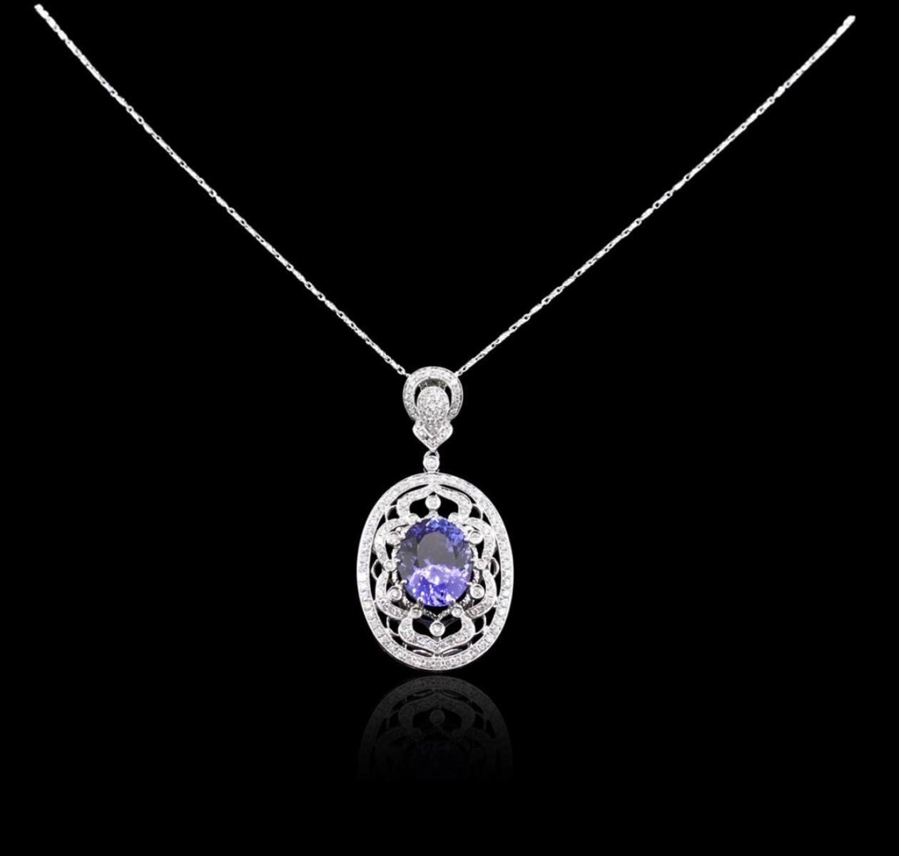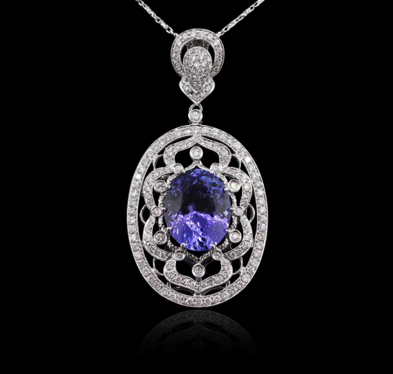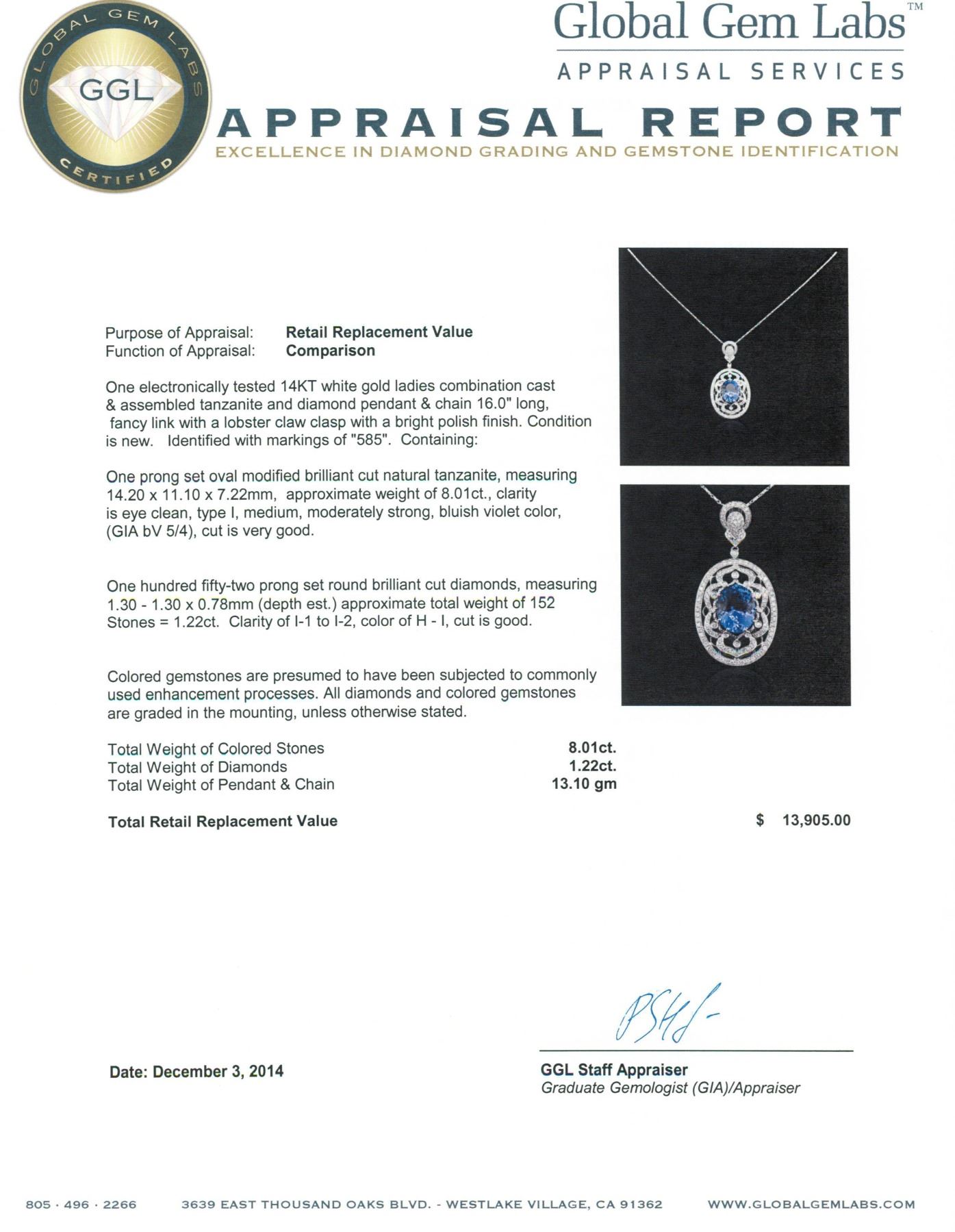 One electronically tested 14KT white gold ladies combination cast & assembled tanzanite and diamond pendant & chain 16.0" long, fancy link with a lobster claw clasp with a bright polish finish. Identified with markings of "585". Condition is new. Containing: One prong set oval modified brilliant cut natural tanzanite, measuring 14.20 x 11.10 x 7.22mm, approximate weight of 8.01ct., clarity is eye clean, type I, medium, moderately strong, bluish violet color, (GIA bV 5/4), cut is very good. One Hundred Fifty-Two prong set round brilliant cut diamonds, measuring 1.30 - 1.30 x 0.78mm (depth est.) approximate total weight of 152 Stones = 1.22ct. Clarity: I-1 to I-2. Color: H - I, Cut is Good. Colored gemstones are presumed to have been subjected to commonly used enhancement processes. All diamonds and colored gemstones are graded in the mounting, unless otherwise stated. Total Weight of Colored Stones 8.01ct. Total Weight of Diamonds 1.22ct. Total Weight of Pendant & Chain 13.10 grams. GGL Appraised at $13,905.00.