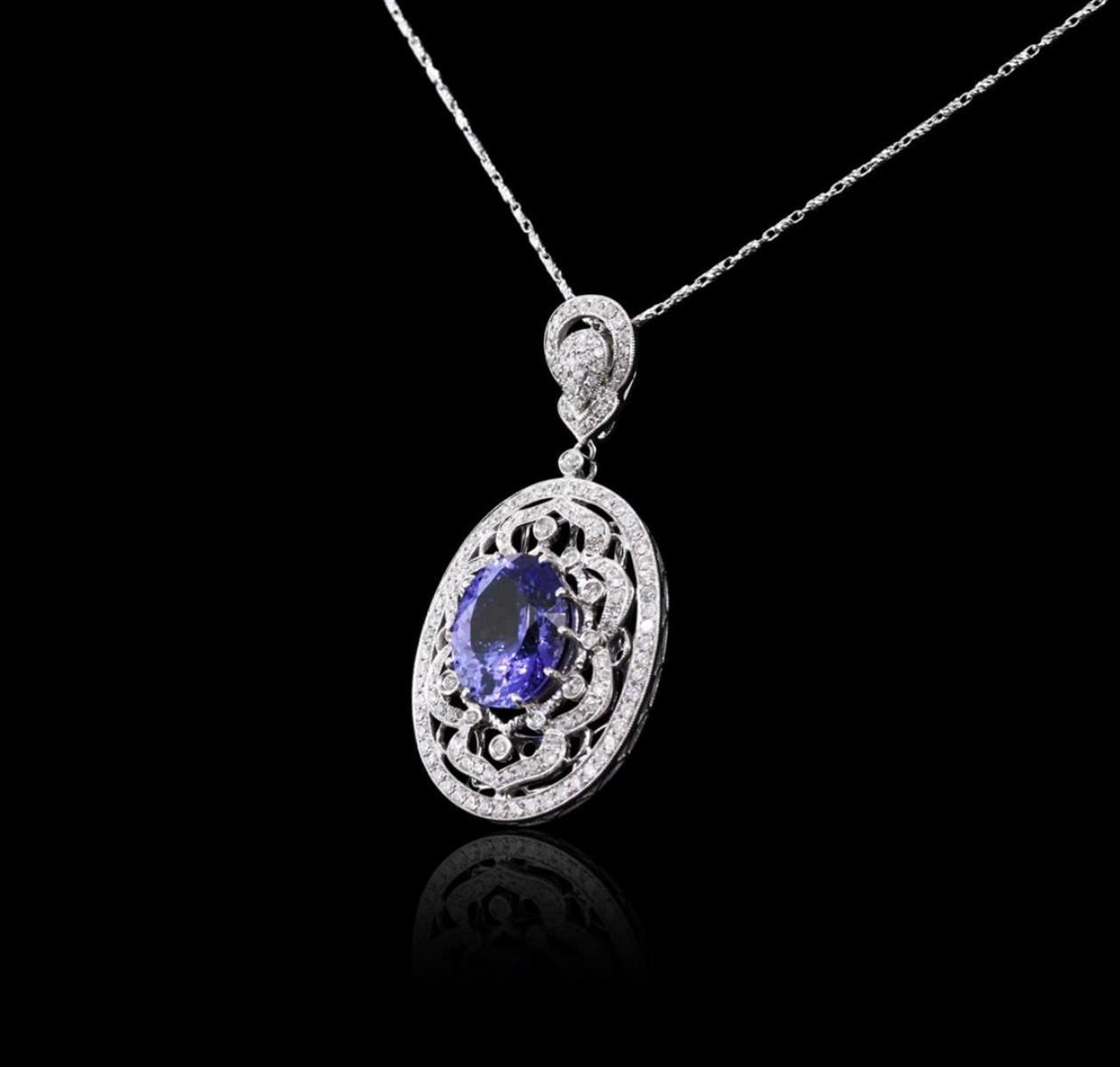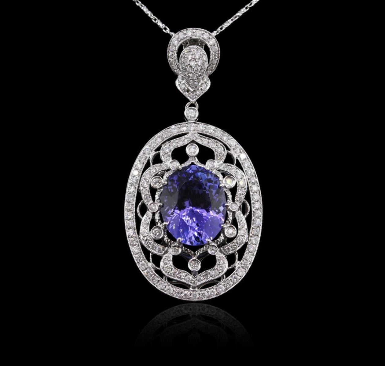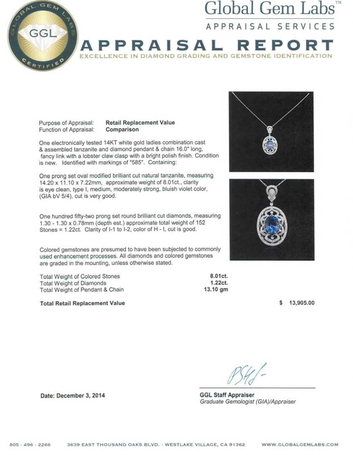 One electronically tested 14KT white gold ladies combination cast & assembled tanzanite and diamond pendant & chain 16.0" long, fancy link with a lobster claw clasp with a bright polish finish. Identified with markings of "585". Condition is new. Containing: One prong set oval modified brilliant cut natural tanzanite, measuring 14.20 x 11.10 x 7.22mm, approximate weight of 8.01ct., clarity is eye clean, type I, medium, moderately strong, bluish violet color, (GIA bV 5/4), cut is very good. One Hundred Fifty-Two prong set round brilliant cut diamonds, measuring 1.30 - 1.30 x 0.78mm (depth est.) approximate total weight of 152 Stones = 1.22ct. Clarity: I-1 to I-2. Color: H - I, Cut is Good. Colored gemstones are presumed to have been subjected to commonly used enhancement processes. All diamonds and colored gemstones are graded in the mounting, unless otherwise stated. Total Weight of Colored Stones 8.01ct. Total Weight of Diamonds 1.22ct. Total Weight of Pendant & Chain 13.10 grams. GGL Appraised.