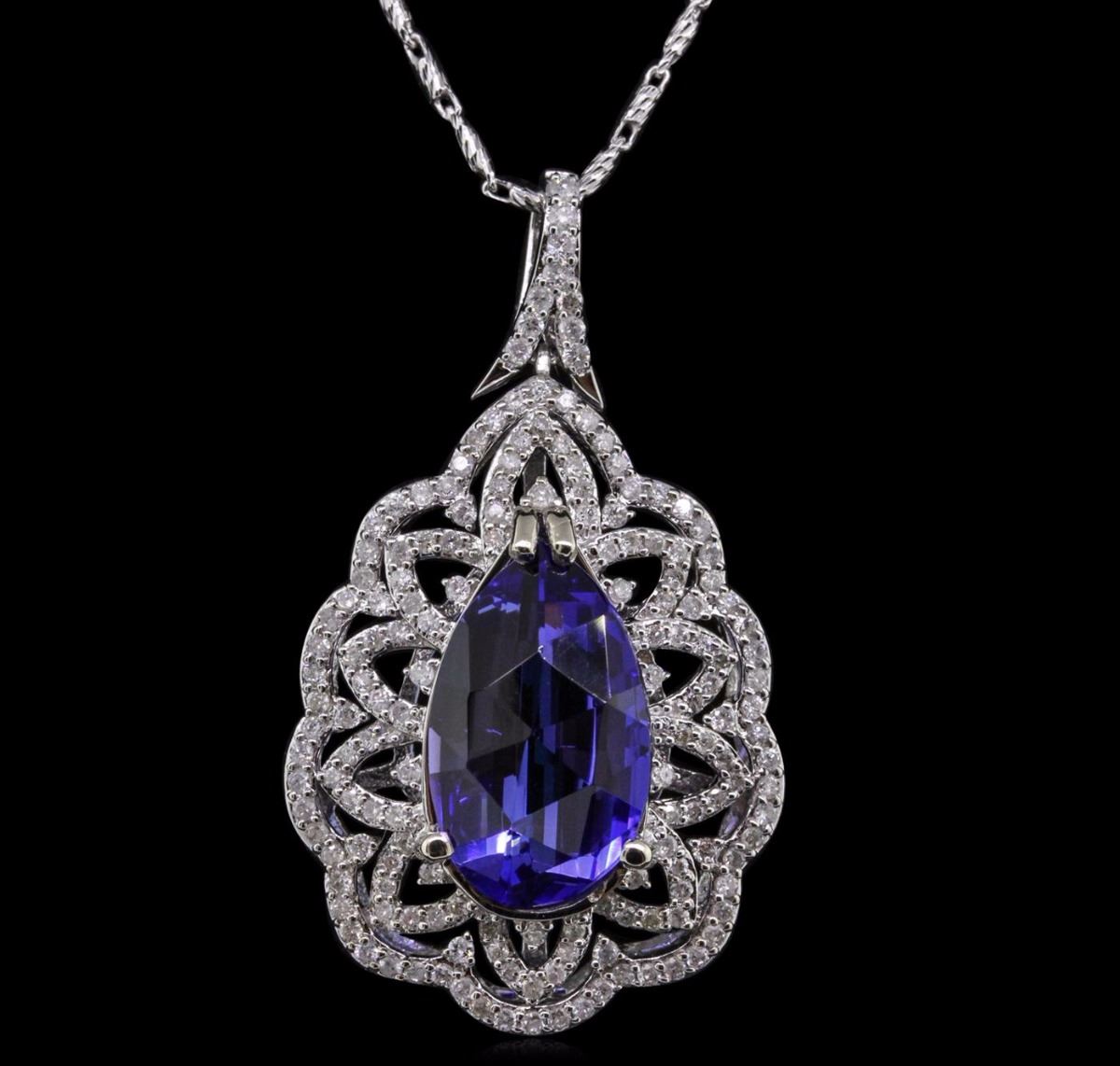 One electronically tested 14KT white gold ladies cast & assembled tanzanite and diamond pendant with chain. The pendant features a tanzanite set within a diamond lattice, completed by a diamond set bail. The pendant is supported by an eighteen inch length 14KT white gold designer style chain, terminating in a lobster claw clasp. Bright polish finish. Trademark is PMI. Identified with markings of "14K". Condition is new, good workmanship. Containing: One prong set pear mixed cut natural tanzanite, measuring 16.80 x 10.30 x 6.40mm, 8% bulge factor, approximate weight of 8.01ct., clarity is eye clean, type I, medium dark, very slightly grayish, bluish violet color, (GIA bV 6/3), cut is good. Transmitting light with no distortion, transparent. Colored Stone Grading Report attached. Graded in the setting. Tanzanite is a very rare gemstone that is only found in the country of Tanzania. Originally discovered in 1967. Tiffany & Company, named the stone Tanzanite. It is found in the Usumburu Mountains that border the Umba Valley of northern Tanzania. Tanzanite occurs in gray, brown, violet, blue, reddish-purple, & green. The gem is interesting because of its exceptional pleochroism. Rotated in different directions a tanzanite will exhibit multiple changes of color. Tanzanite has a low tolerance to ultrasonic cleaning, and should not be cleaned using this method. One Hundred Sixty-Two prong set round brilliant cut diamonds, measuring 1.20 - 1.10 x 0.69mm (depth est.) approximate total weight of 162 Stones = 1.00ct. Graded in the setting. Clarity: I-1 to I-2. Color: G - I. Total Weight of Colored Stones 8.01ct. Total Weight of Diamonds 1.00ct. Total Weight of Pendant With Chain 11.92 grams. AIG Appraised at $25,040.00.
