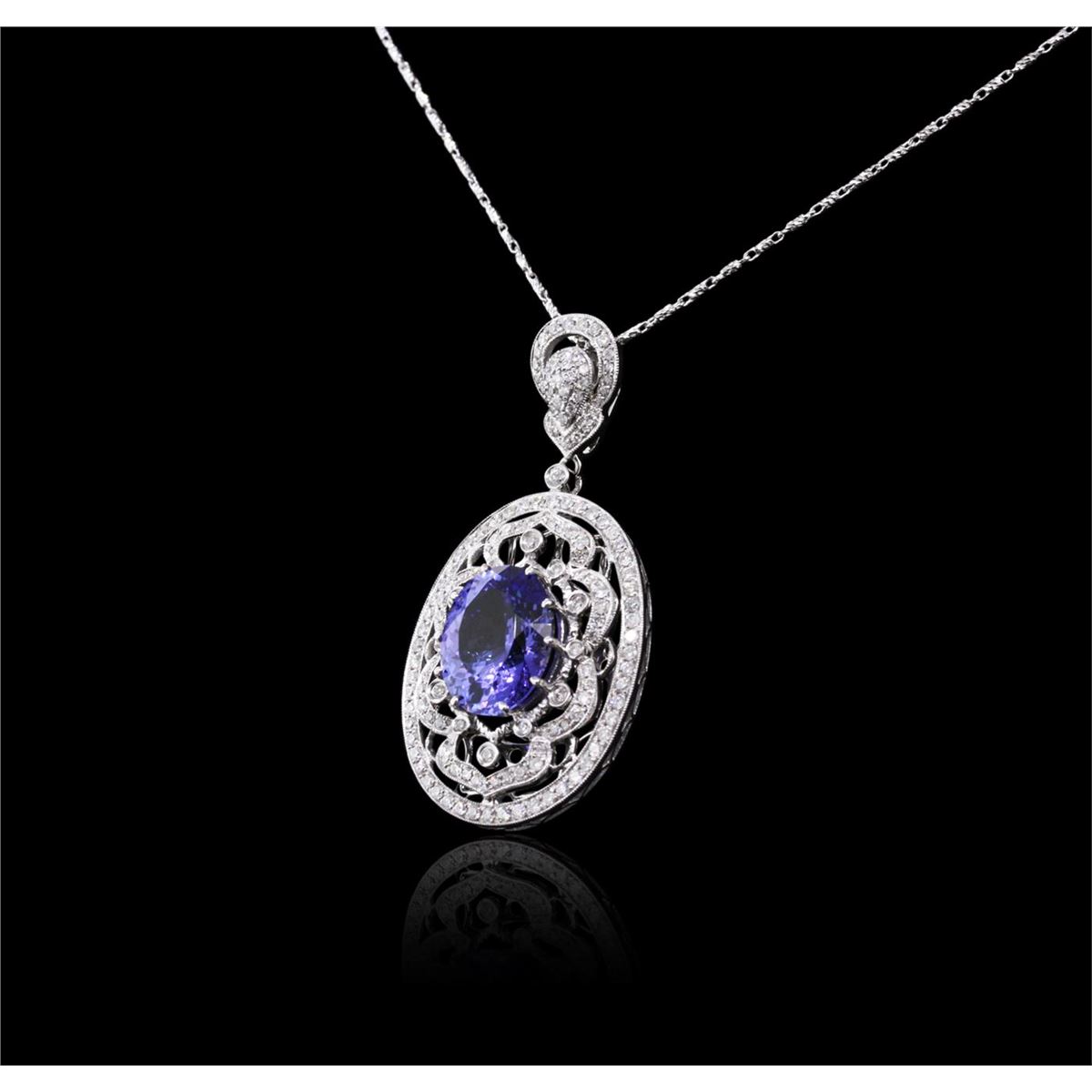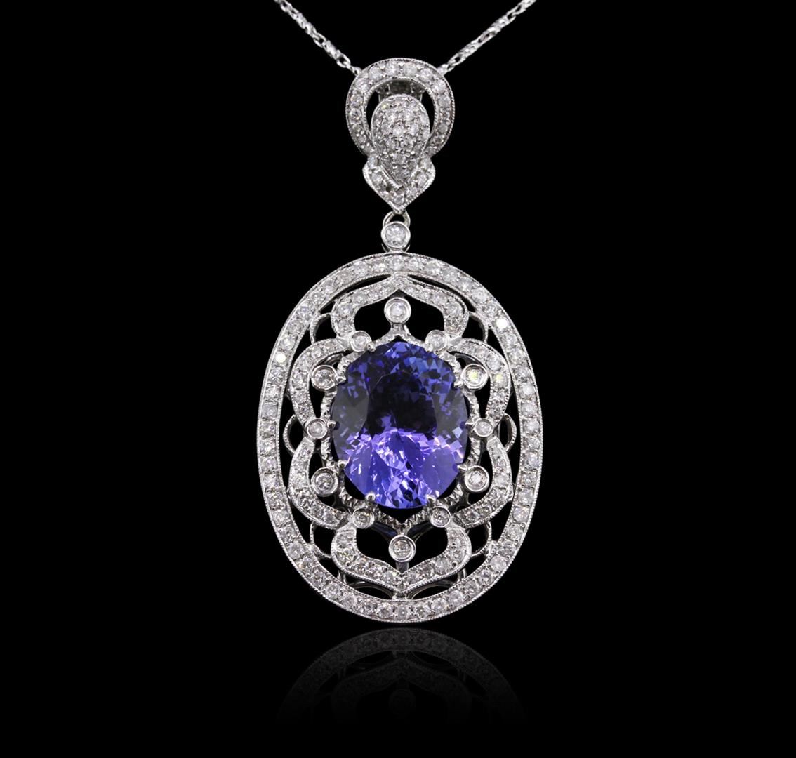 One electronically tested 14KT white gold ladies combination cast & assembled tanzanite and diamond pendant & chain 16.0" long, fancy link with a lobster claw clasp with a bright polish finish. Identified with markings of "585". Condition is new. Containing: One prong set oval modified brilliant cut natural tanzanite, measuring 14.20 x 11.10 x 7.22mm, approximate weight of 8.01ct., clarity is eye clean, type I, medium, moderately strong, bluish violet color, (GIA bV 5/4), cut is very good. One Hundred Fifty-Two prong set round brilliant cut diamonds, measuring 1.30 - 1.30 x 0.78mm (depth est.) approximate total weight of 152 Stones = 1.22ct. Clarity: I-1 to I-2. Color: H - I, Cut is Good. Colored gemstones are presumed to have been subjected to commonly used enhancement processes. All diamonds and colored gemstones are graded in the mounting, unless otherwise stated. Total Weight of Colored Stones 8.01ct. Total Weight of Diamonds 1.22ct. Total Weight of Pendant & Chain 13.10 grams. GGL Appraised at $13,905.00.