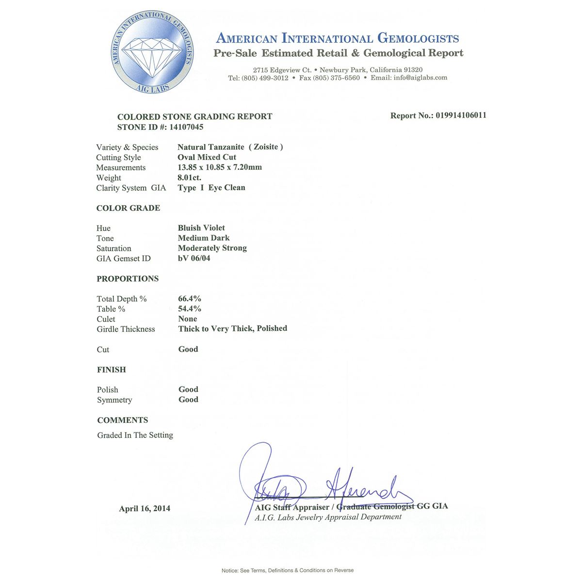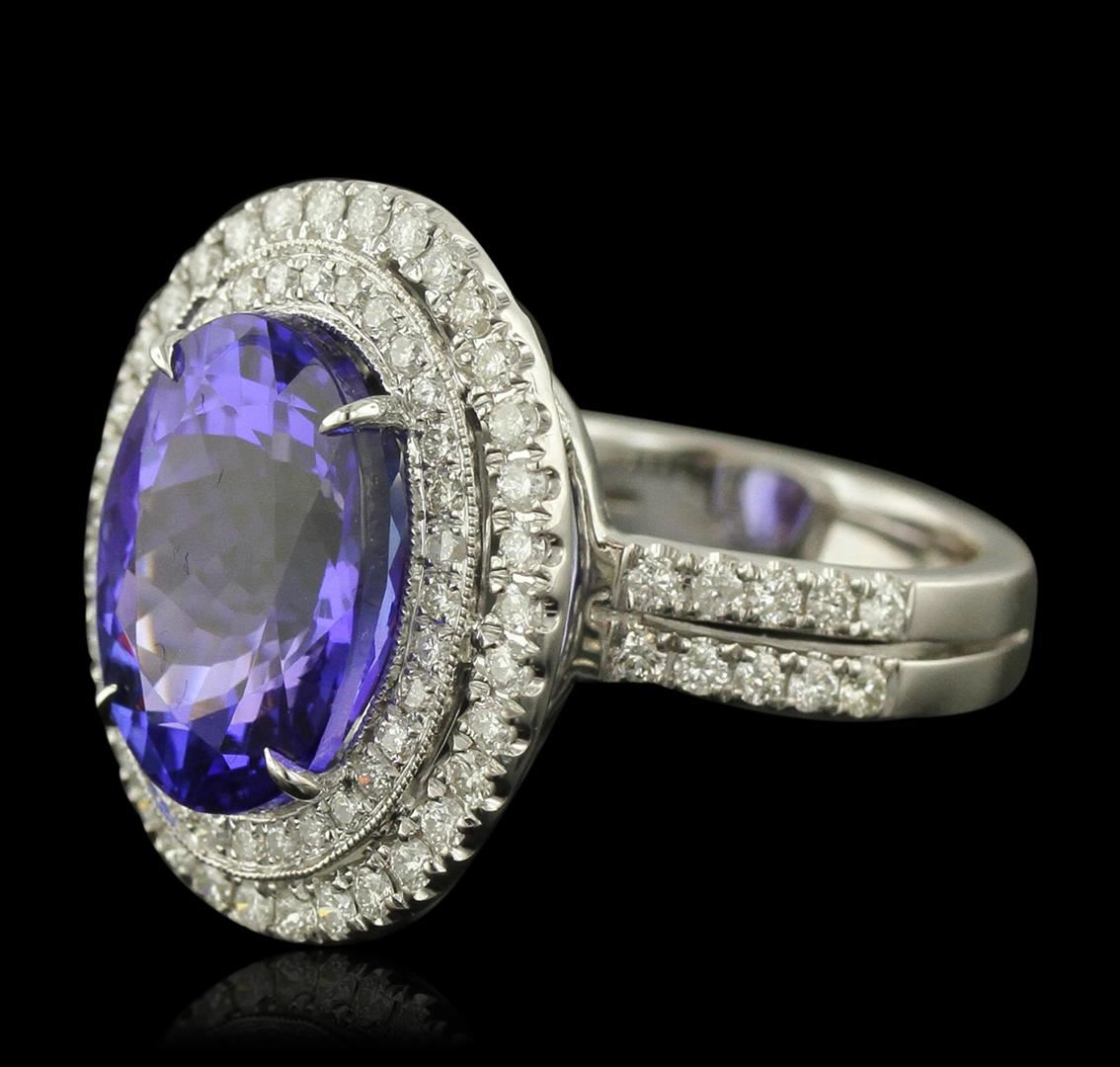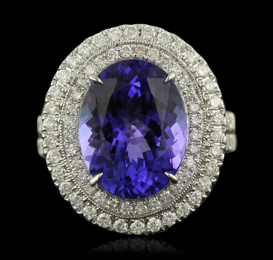 One electronically tested 14KT white gold ladies cast tanzanite and diamond ring. Condition is new, good workmanship. The featured tanzanite is set within a two tiered diamond lattice gallery, supported by diamond set split shoulders and completed by a four millimeter wide band. Bright polish finish with milgrain detailing throughout. Trademark is UCG. Identified with markings of "14K 585". Containing: One prong set oval mixed cut natural tanzanite, measuring 13.85 x 10.85 x 7.20mm, 8%. bulge factor, approximate weight of 8.01ct., clarity is eye clean, type I, medium dark, moderately strong, bluish violet color, (GIA bV 6/4), cut is good. Transmitting light with no distortion, transparent. Colored Stone Grading Report attached. Graded in the setting. Tanzanite is a very rare gemstone that is only found in the country of Tanzania. Originally discovered in 1967. Tiffany & Company, named the stone Tanzanite. It is found in the Usumburu Mountains that border the Umba Valley of northern Tanzania. Tanzanite occurs in gray, brown, violet, blue, reddish-purple, & green. The gem is interesting because of its exceptional pleochroism. Rotated in different directions a tanzanite will exhibit multiple changes of color. Tanzanite has a low tolerance to ultrasonic cleaning, and should not be cleaned using this method. Forty-Four prong set round brilliant cut diamonds, measuring 1.40 - 1.30 x 0.81mm (depth est.) approximate. Total Weight of 44 Stones = 0.49ct. Graded in the setting. Clarity: SI-2 to I-2. Color: F - H Fifty-Four prong set round brilliant cut diamonds, measuring 1.60 - 1.50 x 0.93mm (depth est.) approximate. Total Weight of 54 Stones = 0.83ct. Graded in the setting. Clarity: SI-2 to I-2. Color: F - H. Total Weight of Colored Stones 8.01ct. Total Weight of Diamonds 1.32ct. Total Weight of Ring 8.70 grams. AIG Appraised at $25,525.00.