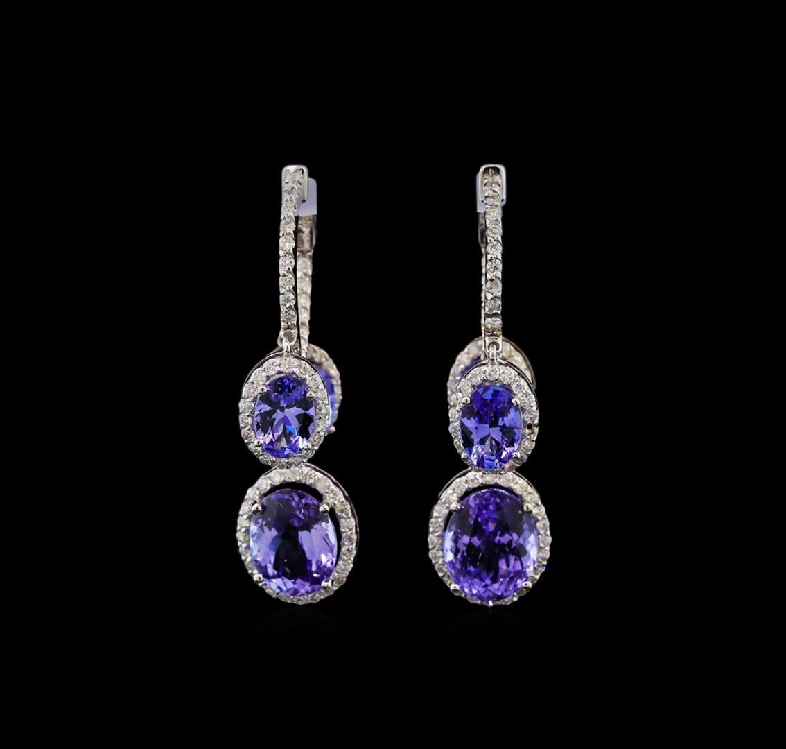 One pair electronically tested 14KT white gold ladies cast tanzanite and diamond earrings with hinged clip backs with a bright polish finish. Identified with markings of "14K". Condition is new. Containing: Two prong set oval modified brilliant cut natural tanzanites, measuring 9.50 x 7.50 x 4.88mm, approximate total weight of 4.90ct., clarity is eye clean, type I, light, very slightly grayish, violet color, (GIA V 3/3), cut is good. Four prong set oval modified brilliant cut natural tanzanites, measuring 7.00 x 5.00 x 3.25mm, approximate total weight of 3.20ct., clarity is eye clean, type I, medium light, very slightly grayish, violet color, (GIA V 4/3), cut is good. One Hundred Forty-Four prong set round brilliant cut diamonds, measuring 1.20 - 1.20 x 0.72mm (depth est.) approximate total weight of 144 Stones = 0.91ct. Clarity: SI-2 to I-1. Color: I - J, Cut is Good. Colored gemstones are presumed to have been subjected to commonly used enhancement processes. All diamonds and colored gemstones are graded in the mounting, unless otherwise stated. Total Weight of Colored Stones 8.10ct. Total Weight of Diamonds 0.91ct. Total Weight of Earrings 8.50 grams. GGL Appraised at $6,475.00.