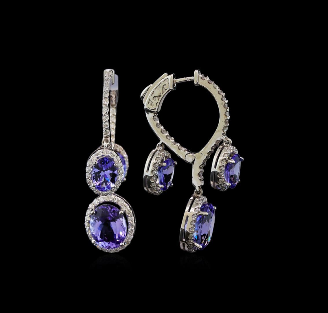 One pair electronically tested 14KT white gold ladies cast tanzanite and diamond earrings with hinged clip backs with a bright polish finish. Identified with markings of "14K". Condition is new. Containing: Two prong set oval modified brilliant cut natural tanzanites, measuring 9.50 x 7.50 x 4.88mm, approximate total weight of 4.90ct., clarity is eye clean, type I, light, very slightly grayish, violet color, (GIA V 3/3), cut is good. Four prong set oval modified brilliant cut natural tanzanites, measuring 7.00 x 5.00 x 3.25mm, approximate total weight of 3.20ct., clarity is eye clean, type I, medium light, very slightly grayish, violet color, (GIA V 4/3), cut is good. One Hundred Forty-Four prong set round brilliant cut diamonds, measuring 1.20 - 1.20 x 0.72mm (depth est.) approximate total weight of 144 Stones = 0.91ct. Clarity: SI-2 to I-1. Color: I - J, Cut is Good. Colored gemstones are presumed to have been subjected to commonly used enhancement processes. All diamonds and colored gemstones are graded in the mounting, unless otherwise stated. Total Weight of Colored Stones 8.10ct. Total Weight of Diamonds 0.91ct. Total Weight of Earrings 8.50 grams. GGL Appraised at $6,475.00.