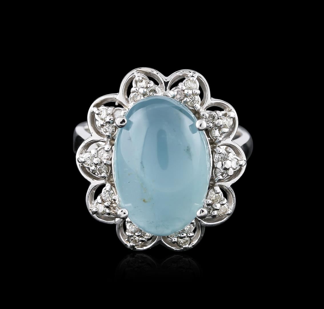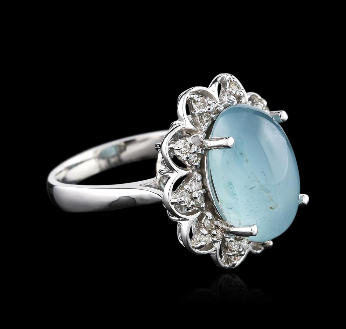 One electronically tested 14KT white gold ladies cast aquamarine and diamond ring with a cathedral shank with a bright polish finish. Identified with markings of "K14". Condition is new. Containing: One prong set oval cabochon cut natural aquamarine, measuring 14.75 x 10.05 x 6.53mm, approximate weight of 8.16ct., clarity is heavily included, type I, medium light, very slightly grayish, blue color, (GIA B 4/3), cut is good. Thirty prong set round brilliant cut diamonds, measuring 1.30 - 1.30 x 0.78mm (depth est.) approximate total weight of 30 Stones = 0.24ct. Clarity: SI-1 to SI-2. Color: J - K, Cut is Good. Diamonds and colored gemstones are graded in the mounting, unless otherwise stated. Colored gemstones are presumed to have been subjected to commonly used enhancement processes. Total Weight of Colored Stones 8.16ct. Total Weight of Diamonds 0.24ct. Total Weight of Ring 6.70 grams. GGL Appraised at $3,365.00.