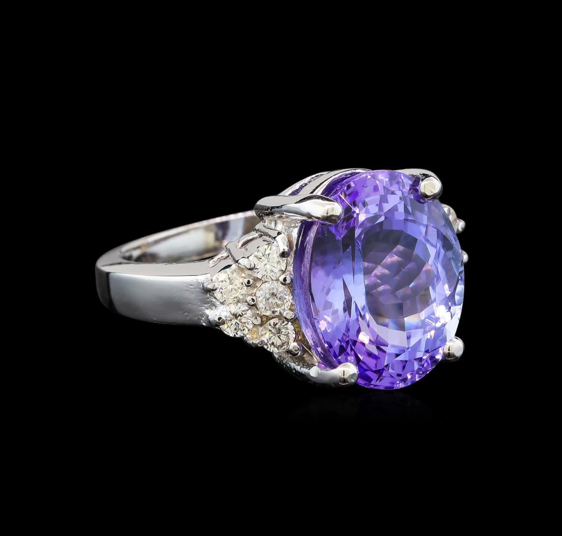 One electronically tested 14KT white gold ladies cast tanzanite and diamond ring with a bright polish finish. Identified with markings of "K14". Condition is new. Containing: One prong set oval modified brilliant cut natural tanzanite, measuring 13.50 x 11.00. x 7.90mm, approximate weight of 8.25ct., clarity is eye clean, type I, medium light, very slightly grayish, violet color, (GIA V 4/3), cut is good. Ten prong set round brilliant cut diamonds, measuring 2.00. - 2.00. x 1.20mm (depth est.) approximate total weight of 10 Stones = 0.29ct. Clarity: SI-1. Color: I - J, Cut is Good. Colored gemstones are presumed to have been subjected to commonly used enhancement processes. All diamonds and colored gemstones are graded in the mounting, unless otherwise stated. Total Weight of Colored Stones 8.25ct. Total Weight of Diamonds 0.29ct. Total Weight of Ring 7.30 grams. GGL Appraised at $5,775.00.