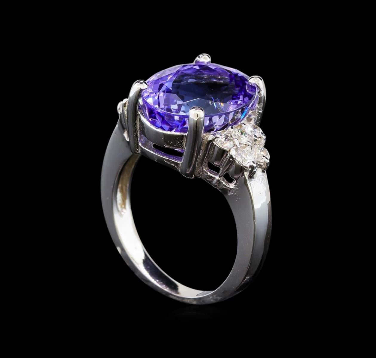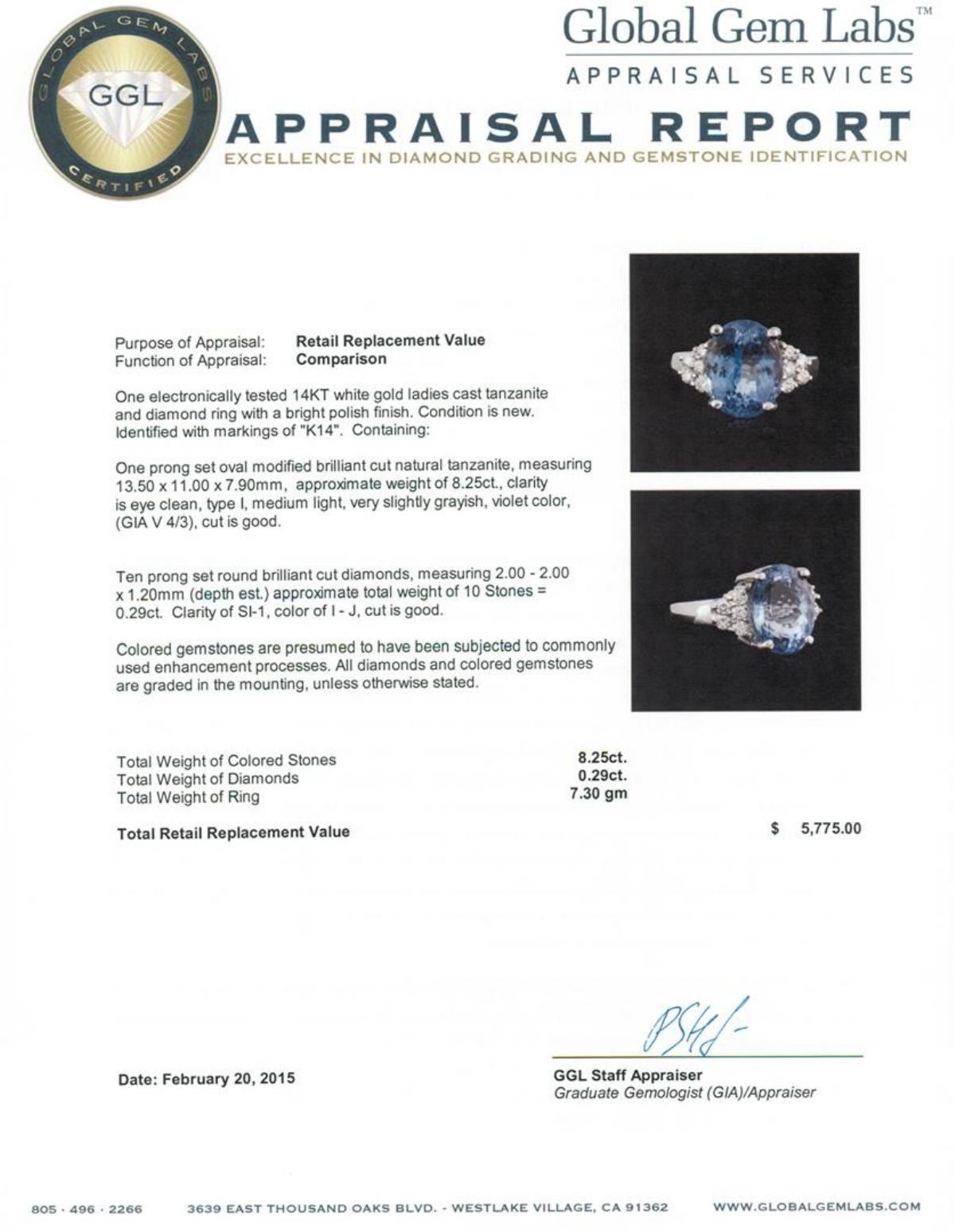 One electronically tested 14KT white gold ladies cast tanzanite and diamond ring with a bright polish finish. Identified with markings of "K14". Condition is new. Containing: One prong set oval modified brilliant cut natural tanzanite, measuring 13.50 x 11.00. x 7.90mm, approximate weight of 8.25ct., clarity is eye clean, type I, medium light, very slightly grayish, violet color, (GIA V 4/3), cut is good. Ten prong set round brilliant cut diamonds, measuring 2.00. - 2.00. x 1.20mm (depth est.) approximate total weight of 10 Stones = 0.29ct. Clarity: SI-1. Color: I - J, Cut is Good. Colored gemstones are presumed to have been subjected to commonly used enhancement processes. All diamonds and colored gemstones are graded in the mounting, unless otherwise stated. Total Weight of Colored Stones 8.25ct. Total Weight of Diamonds 0.29ct. Total Weight of Ring 7.30 grams. GGL Appraised.